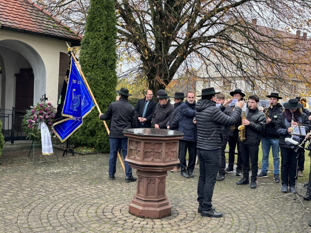 Überwiegend ältere Menshen wohnten der öffentlichen Gedenkfeier im Rahmen des staatlich angeordneten Volkstrauertags bei. Vor der Kriegsopfer-Gedenkstätte hatten Musikerinnen und Musiker des Musikvereins Haisterkirch ihre festen Plätze eingenommen. Dass so viele nach dem anstrengenden Jahreskonzert am Vortag gekommen waren, ist besonders beachtens- und lobenswert.