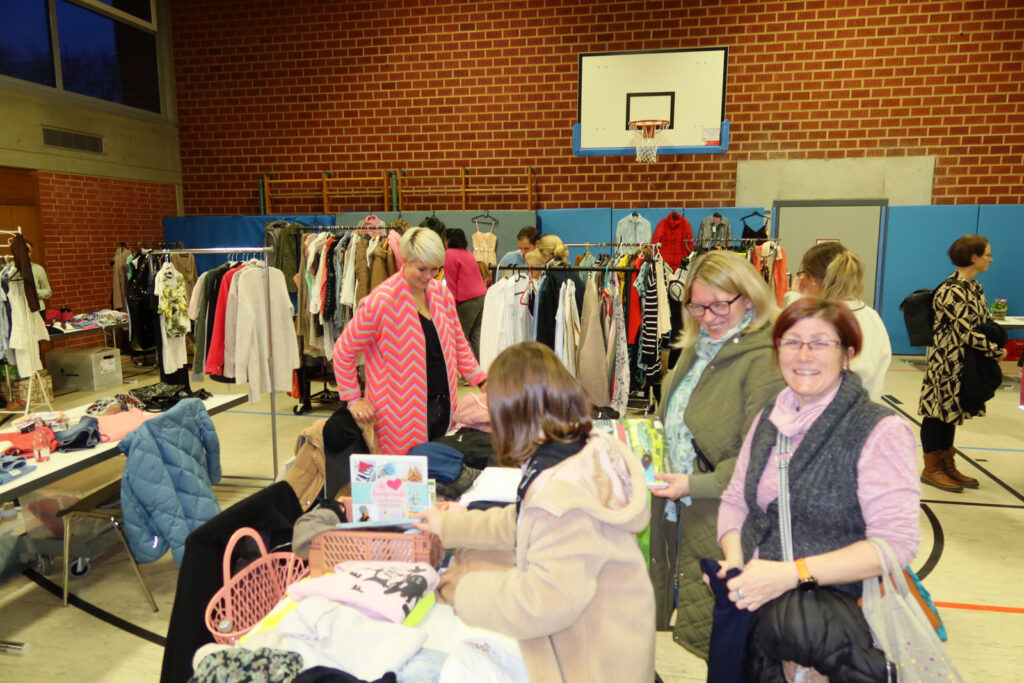 Überall konnte nach Artikeln gestöbert werden. Dieses Mal wurde sogar an einem Tisch im Foyer kostenloses Anbringen von Makeup angeboten. Aufgefallen ist erneut, wie freundlich die Besucherinnen miteinander umgegangen sind. Es hat allen sichtlich Spaß gemacht und fündig geworden sind Käuferinnen und Verkäuferinnen.
