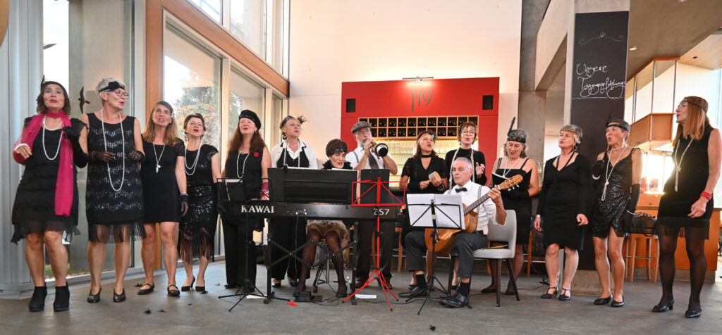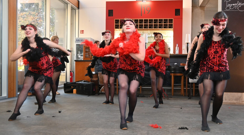 Das Golf-Resort unter Leitung von Sascha Binoth hatte ein unterhaltsames Rahmenprogramm organisiert. Die sieben jungen Damen der Showtanzgruppe der Narrenzunft Bad Schussenried wirbelten im Stil der 20er durch das Foyer und der Frauenchor „InTakt“ aus Bergatreute bot gekonnt Musik der 20er- und 30er-Jahre dar wie zum Beispiel Marlene Dietrichs berühmtes Lied „Ich bin von Kopf bis Fuß auf Liebe eingestellt“ aus dem Film „Der blaue Engel“.