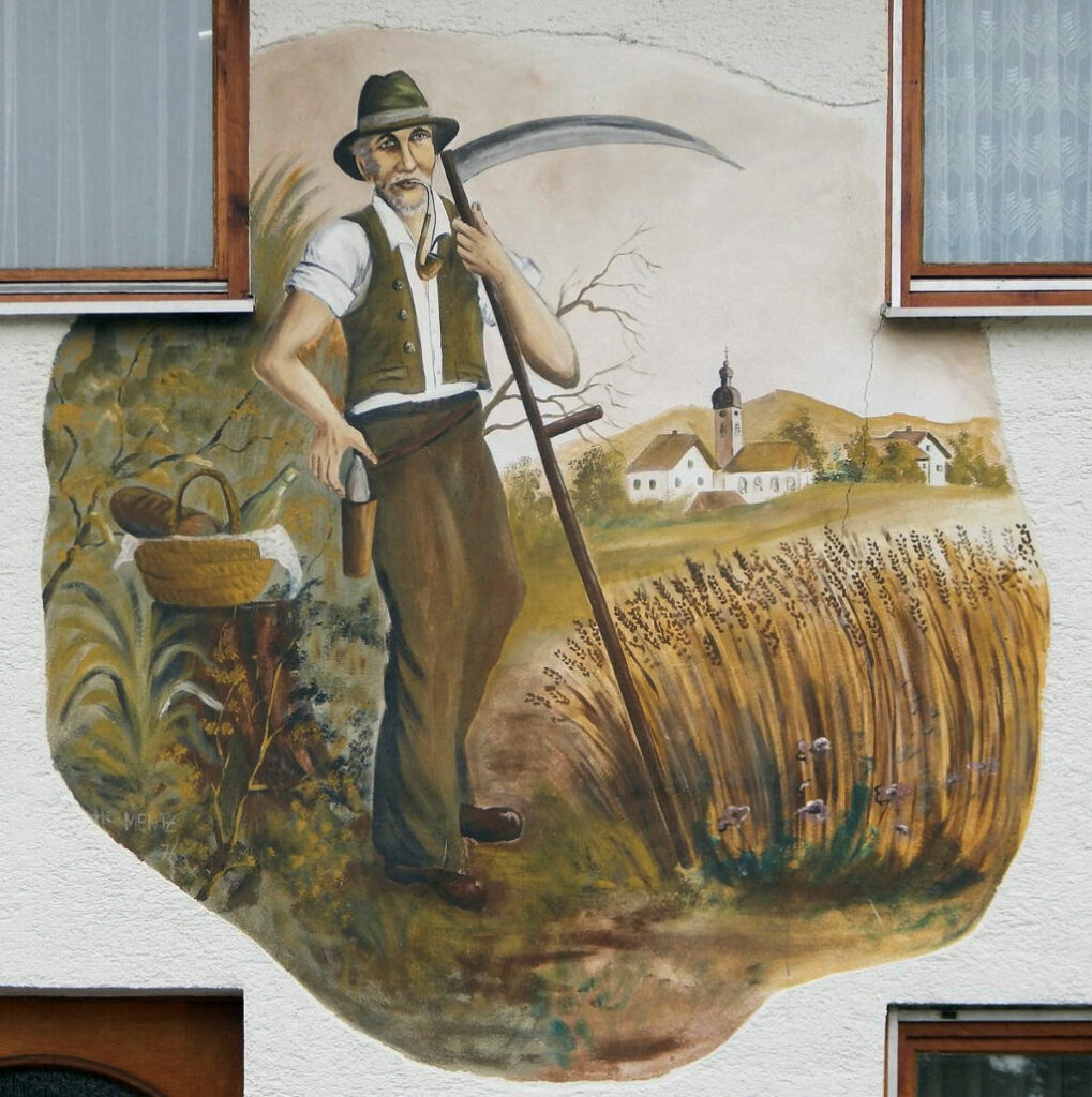 Zum Teil mit landwirtschaftlichen Motiven oder Gebirgslandschaften, aber auch Bilder mit einer charakteristischen Kirche im Hintergrund, also einem lokalen Bezug zu einer Ortschaft. Bei vielen derartigen Bildern lautet die Signatur: He. Mentz. Wer ist dieser He. Mentz, der diese Fassaden-Gemälde erschaffen hat?