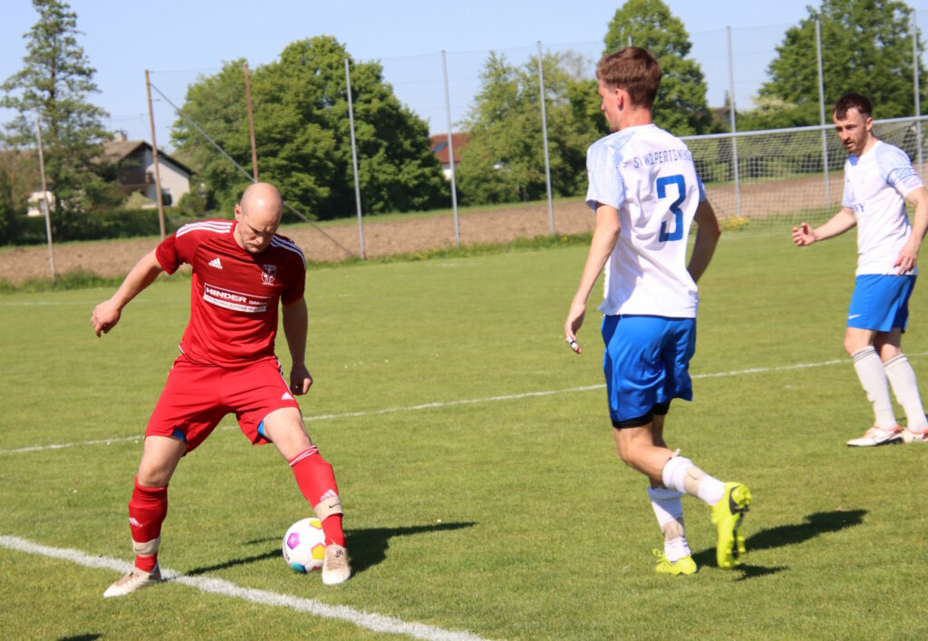 Am Muttertag konnte der SVR im “Sechs”-Punktespiel gegen den SV Wolpertswende mit dem böigen Wind im Rücken beginnen. Nach einem Eckball gingen die Hausherren denn auch früh in Führung. Einen Eckball von Kevin Kraus auf den langen Pfosten köpfte Patrick Bentele in die Mitte, wo SVR-Spielführer Niklas Klawitter keine Mühe hatte, ebenfalls per Kopf das 1:0 zu markieren. Bereits zuvor lag der Ball im Gästetor, doch hatte der stark leitende Unparteiische auf abseits entschieden.