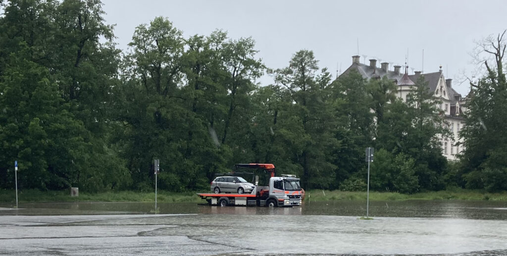 Bad Waldsee – Der endlos niederprasselnde Regen bescherte Bad Waldsee ein paar neue Seen. Der untere Teil des Bleicheparkplatzes ist fast vollständig überflutet. Wer sein Auto nicht rechtzeitig in Sicherheit brachte, ist gut beraten, sich hohe Gummistiefel anzuziehen, um sein Gefährt noch trockenen Fußes zu erreichen. Bürgermeisterin Ludy und Feuerwehrkommandant Burkhardt sind seit dem frühen Morgen im Einsatz und informieren sich vor Ort von der aktuellen Situation. Unser Reporter war heute Morgen ab 7.30 Uhr unterwegs. Die Fotos stammen aus dem Zeitraum 7.30 Uhr bis 9.30 Uhr-