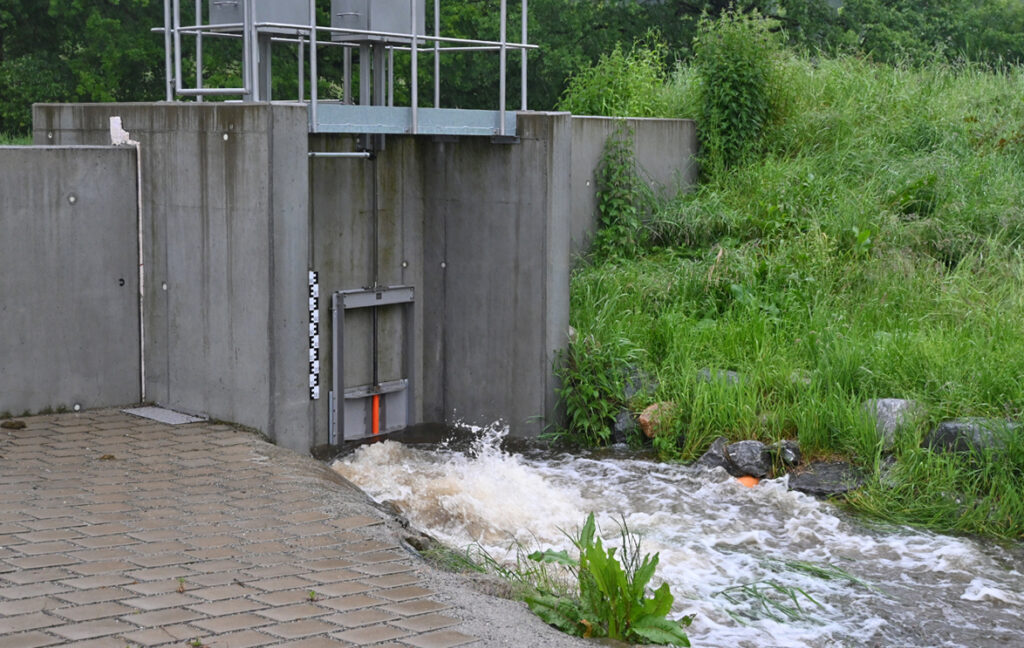 Kontrollierter Wasserabfluss am Rückhaltebecken Kurgebiet.
