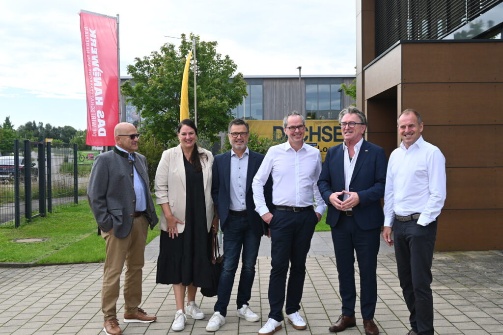 Am Dienstag, 5. August, vor der Schreinerei Wirth-Bucher im Gewerbegebiet Wasserstall. Versammelt haben sich (von links) Otto Birk (stellvertretender Handwerksmeister), Dr. Anja Reinalter (Bundestagsabgeordnete der Grünen), Martin Bloching (stellvertretender Kreishandwerksmeister), Michael Bucher (Kreishandwerksmeister und Inhaber des Bad Waldseer Betriebes), Landesminister Manfred Lucha, Franz Moosherr (Geschäftsführer der Kreishandwerkerschaft). Minister Dr. Danyal Bayaz und die Landtagsabgeordnete Petra Krebs (Die Grünen) stießen noch hinzu. Foto: Erwin Linder
