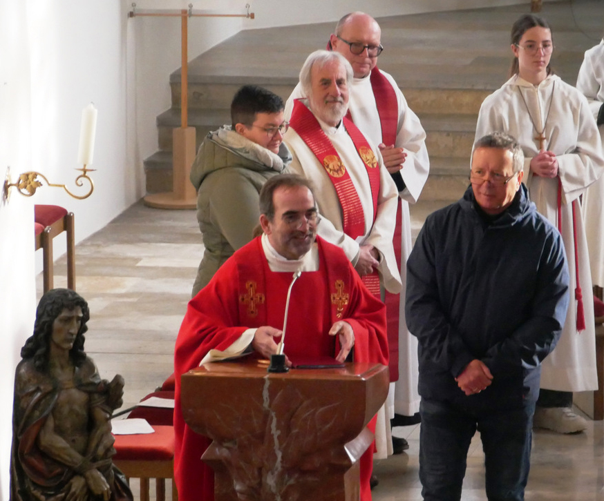 Den Priestern und Diakonen, den Minis, dem Organisten, den Lektorinnen, den Verantwortlichen für die Mesnerdienste und all den Helferinnen und Helfern dankten am Schluss des Festgottesdienstes Pfarrer Stefan Werner und der Gewählte Vorsitzende des Kirchengemeinderats Rolf Heber. Dankbaren Beifall spendeten die Gottesdienstbesucher. Der Befall war groß, als dem Festprediger Benjamin Sigg ein Präsent von der Kirchengemeinde übergeben wurde.