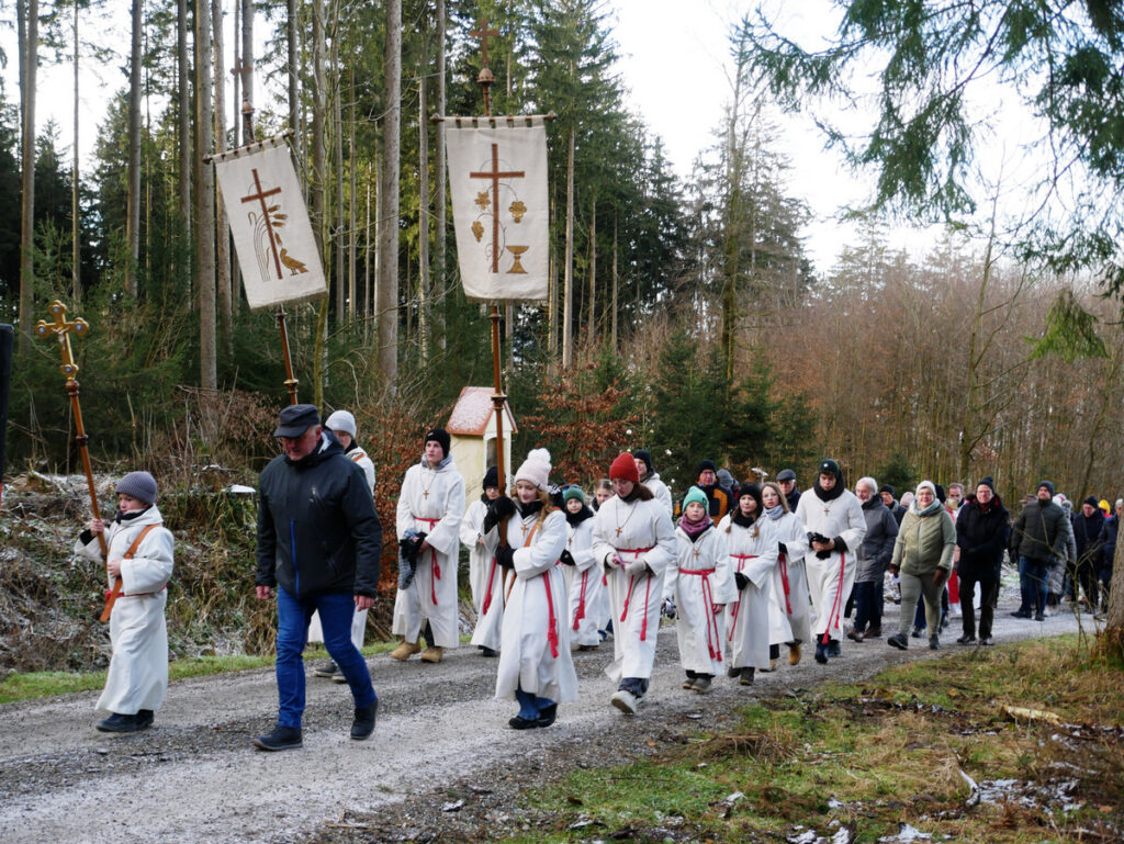 Natürlich zogen die Ministranten mit der Prozession hinauf zur Sebastianskapelle, hoch über Haisterkirch im Wald gelegen. Foto: Lothar Menz
