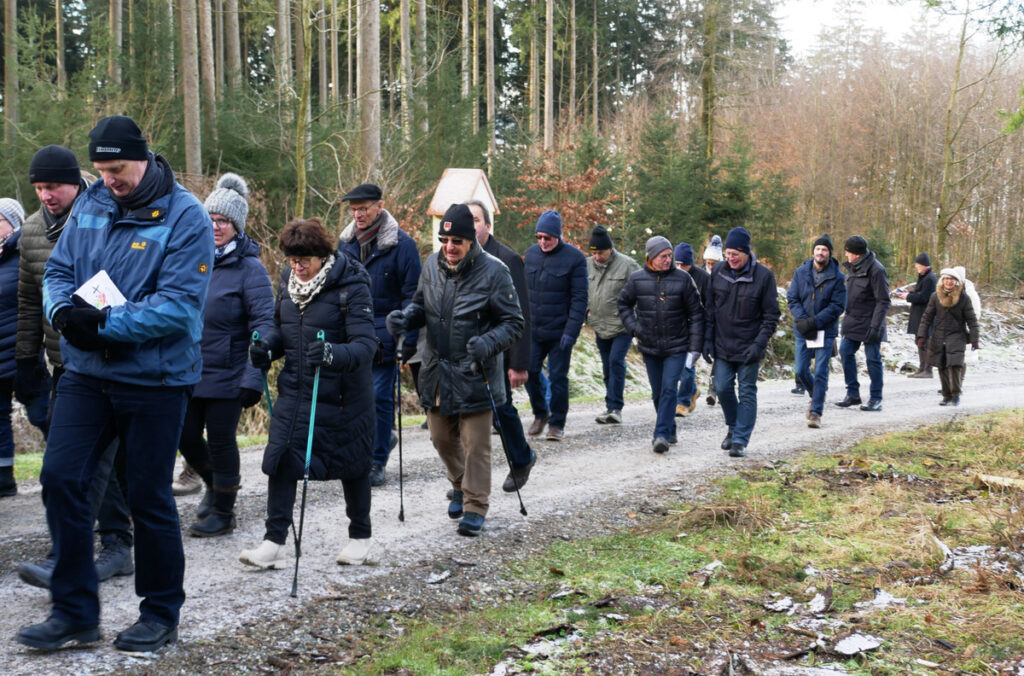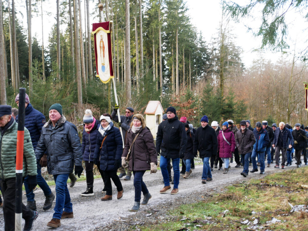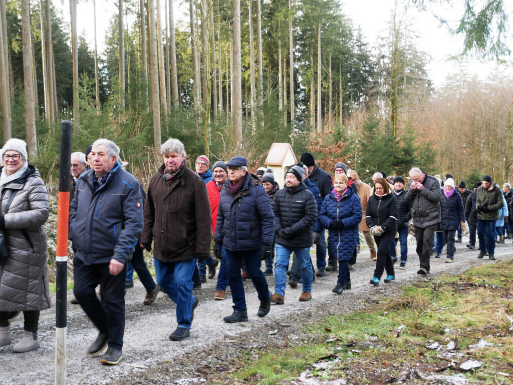 Beispielhaft sei eine siebenköpfige Männergruppe aus Bergatreute genannt, die sich schon um 7.00 Uhr zu Fuß von ihrem Heimatort Bergatreute nach Haisterkirch aufgemacht hatte, um rechtzeitig dem Festgottesdienst um 9.00 Uhr beiwohnen zu können. Dann schloss sich die Gruppe der Prozession an, immer bergauf zur Kapelle St. Sebastian und dazu betend und singend, wie all die Wallfahrtteilnehmenden. Die Namen der sieben Bergatreuter seien genannt. Es waren: Josef Forderer, Theo Hepp, Hans Hoh, Manfred Hoh, Rainer Hoh, Karl Klawitter und Franz Josef Teufel.