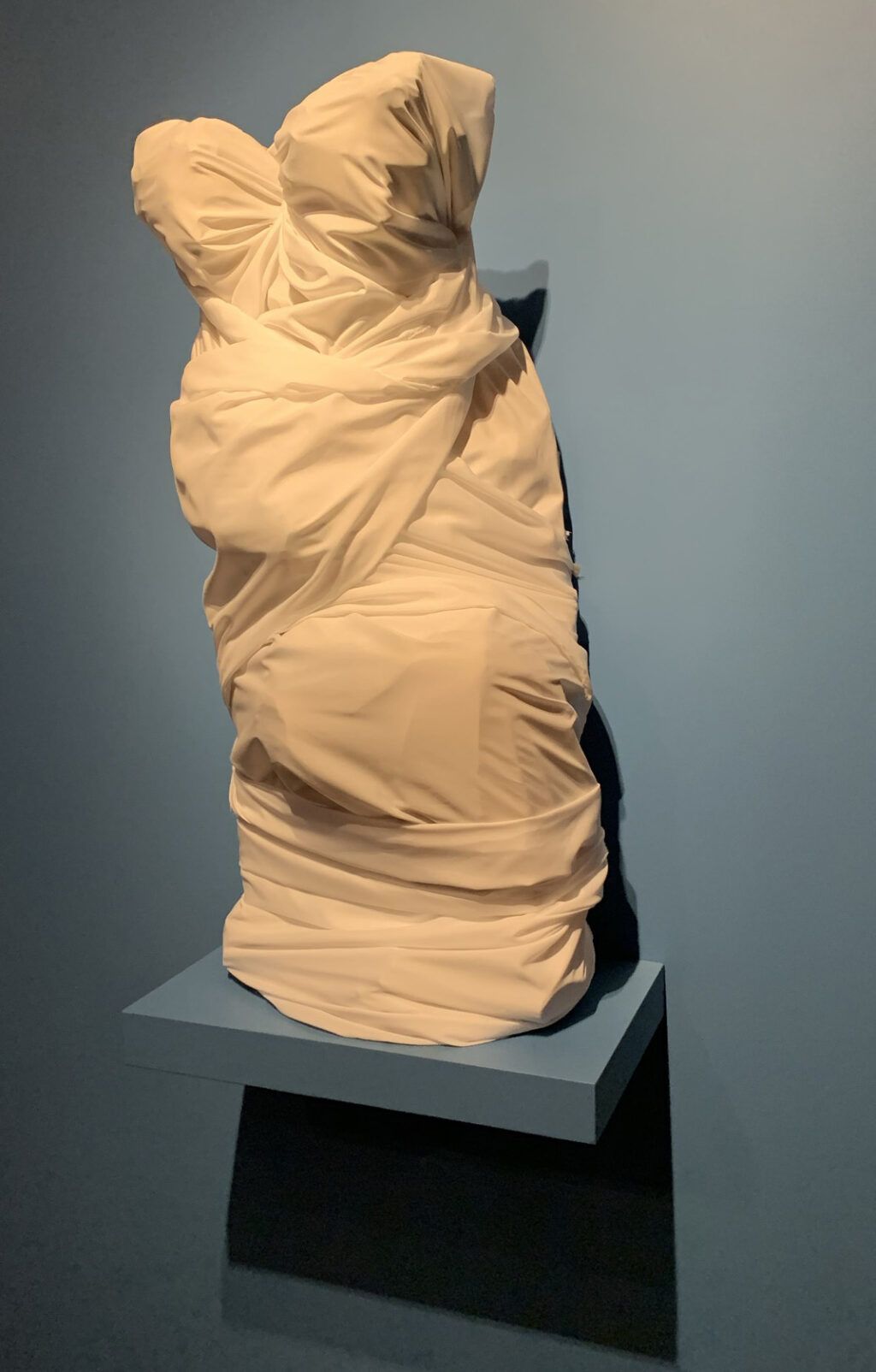 Im Obergeschoss suche der Künstler das Gestaltungsprinzip der Veränderung von Bestehendem hin zu neuen Wahrnehmungsperspektiven. Er verhüllt vier Skulpturen, wiederum in Weiß und finde durch Verdrängung eine Sichtschärfung, die die Figuren nur noch erahnen lassen. Üppiger Barock werde so zu minimaler Transparenz beziehungsweise schwerer Marmor zu Leichtigkeit. Verhüllt wurden Constantin Dauschs Omphale, der ungefasste flügellose Verkündungsengel Gabriel, der Evangelist Matthäus mit Engel und der Thronende Christus aus der Zürnschen Sammlung des Museums.
