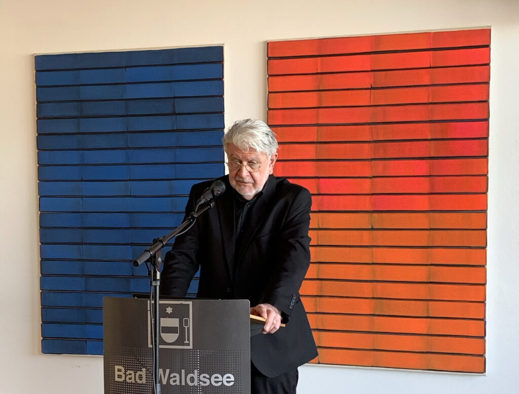 Axel Otterbach, der Leiter des Kunstraums „kleine galerie“ durfte zahlreich zur Vernissage erschienene Gäste begrüßen, unter ihnen Altbürgermeister Rudolf Forcher und Axel Musch, den neuen Leiter des städtischen Fachbereichs Wirtschaft, Tourismus, Kultur. Otterbach bemängelte den leider sinkenden Stellenwert der Kultur, der sich in Kürzungen der öffentlichen Zuwendungen beispielsweise für den Kunstfonds und in vernachlässigender Thematisierung durch die Medien zeige. Letzteres sei auch für die heutige Vernissage der Fall. Otterbach dazu sarkastisch: „Die Kulturschaffenden müssen betteln gehen!“ Nur gut, dass wenigstens die Kurstadt dem Kunstraum keine Kürzungen zumute. Mit berechtigtem Stolz stellte er Jost Münster vor, der auf bedeutende Ausstellungen zurückblicken darf und derzeit gleichzeitig in Singapur und in Bad Waldsees „kleiner galerie’ ausstellt. Mit dem in Saarbrücken lebenden Kunstgeschichtler Dr. Ralf Christofori konnte der Galerieleiter einen Laudator gewinnen, der Jost Münster und dessen Schaffen schon sehr lange kennt.