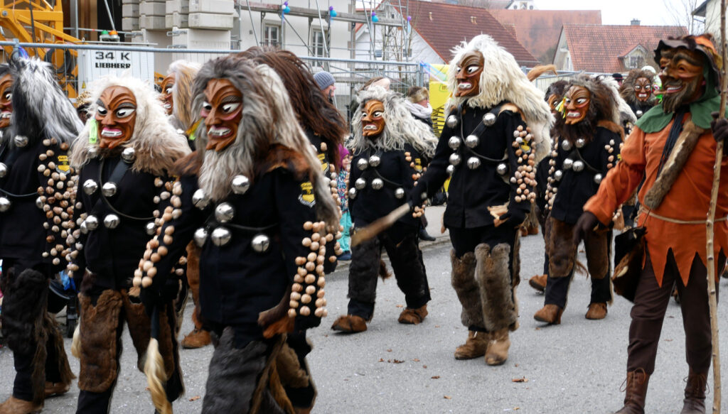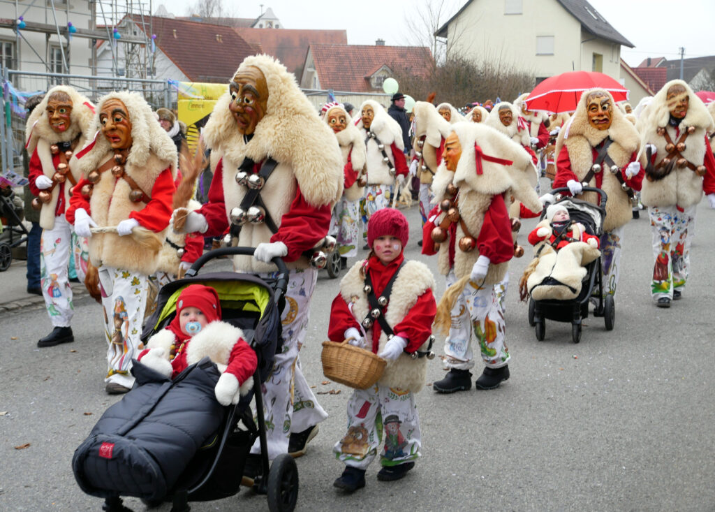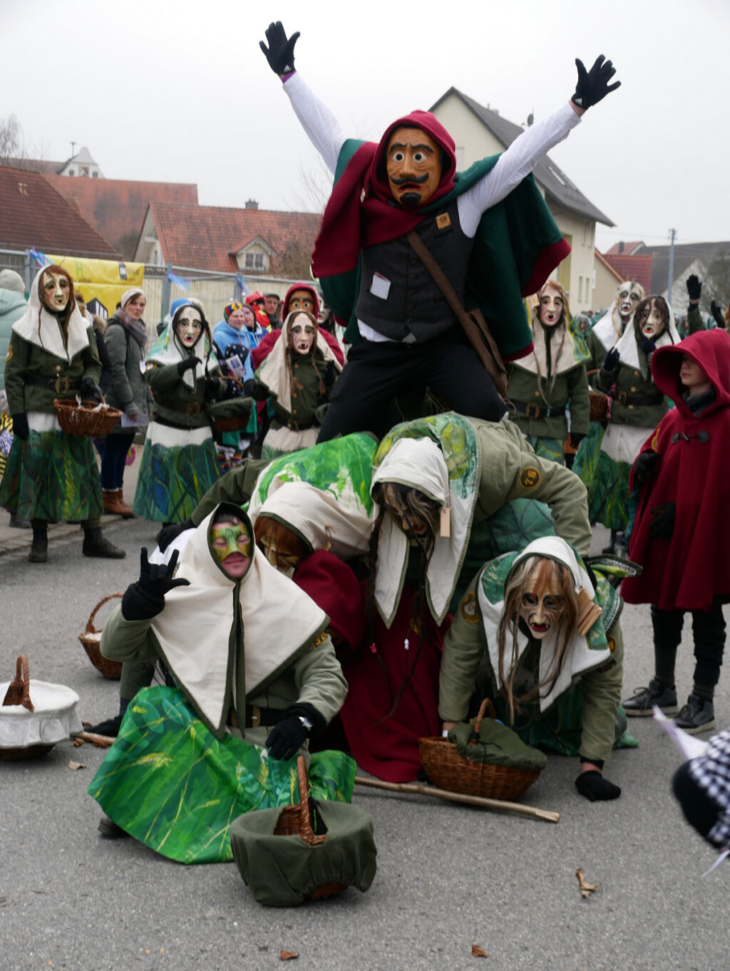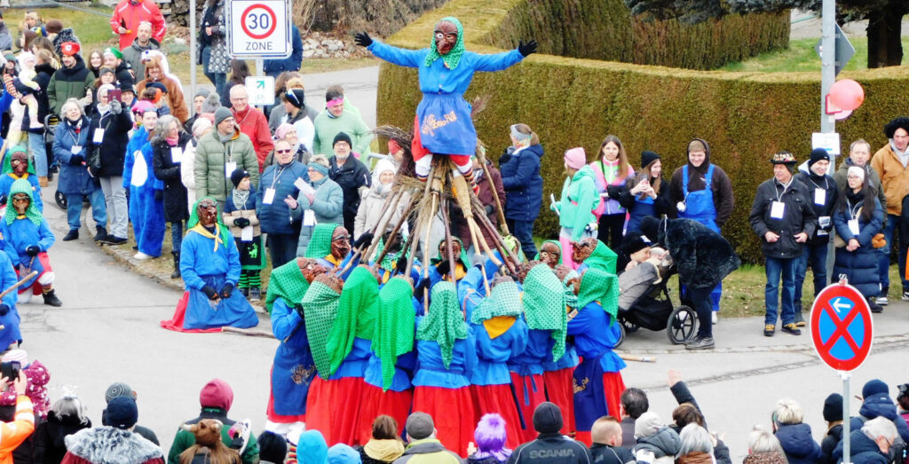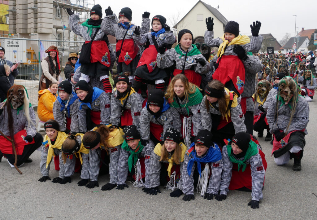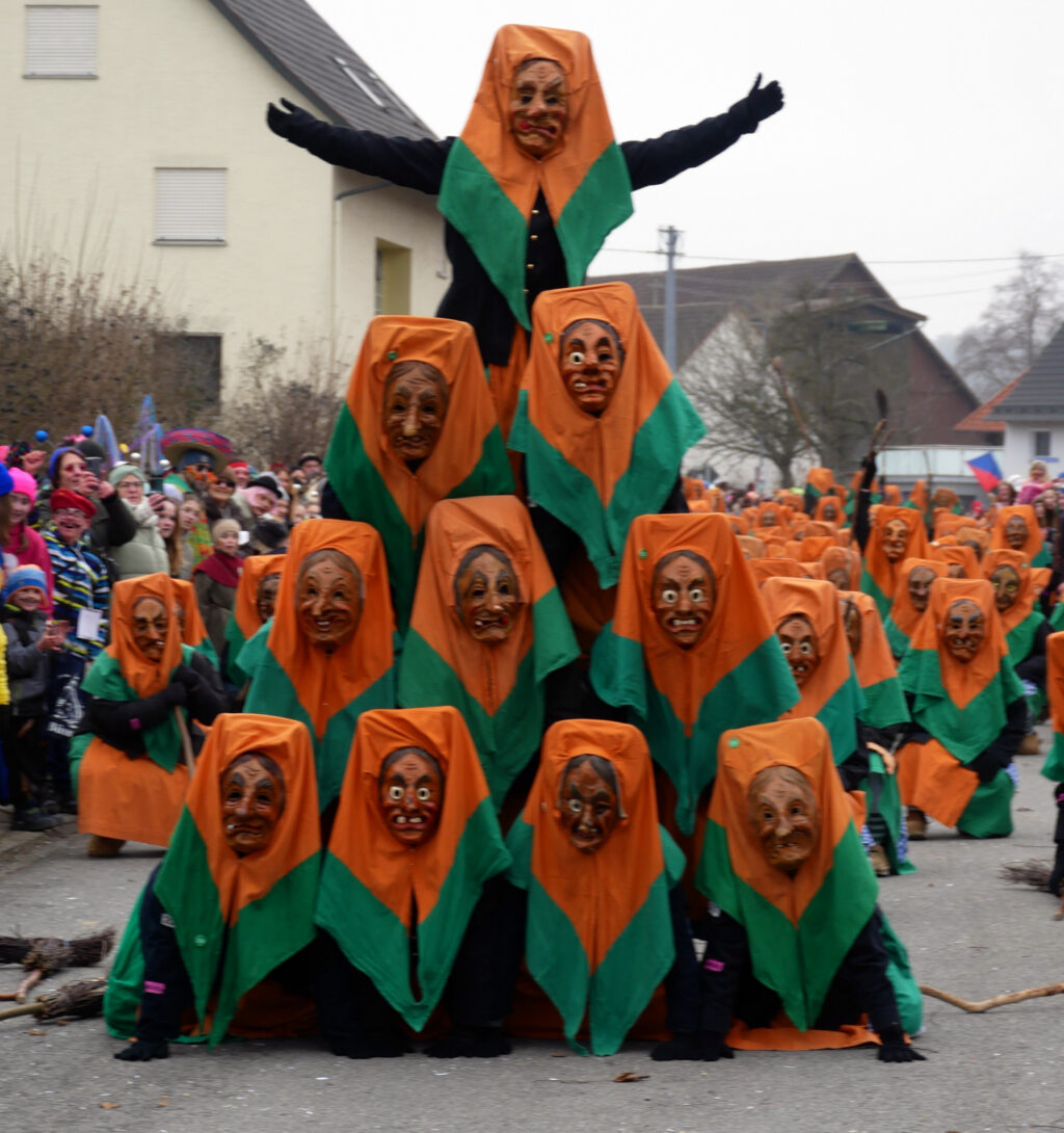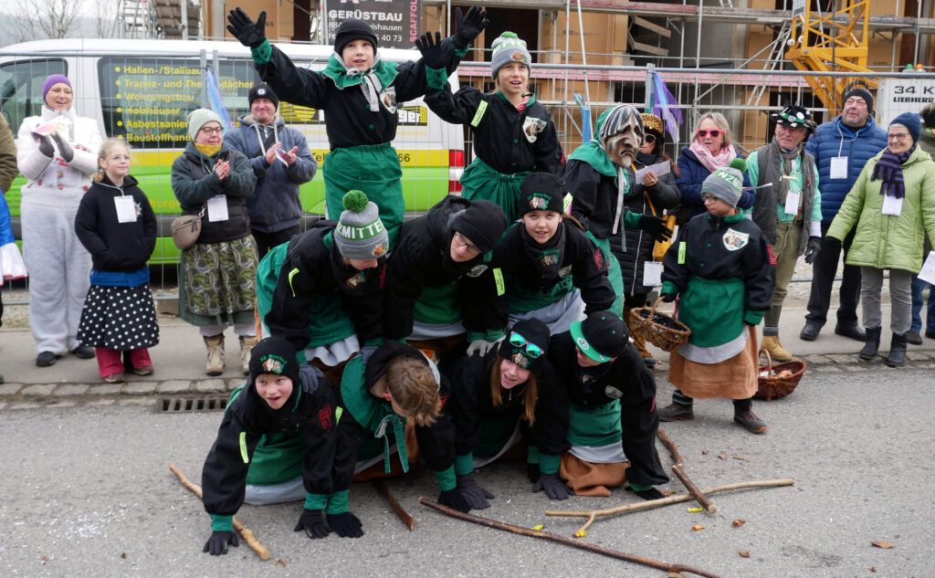 Kleine und große Masken- und Hästräger bauten sehenswerte Pyramiden auf. Auch ganz in der Nähe der Tribüne: die Patenzunft NV Zenke-Rälle Moosheim, die NZ Ried-Graddla Ummendorf, die NZ d`Langjupp Seibranz, die NZ Mittelbuch, die Narrenzunft Berengar Bergatreute und Narrenzunft Eberhardzell.