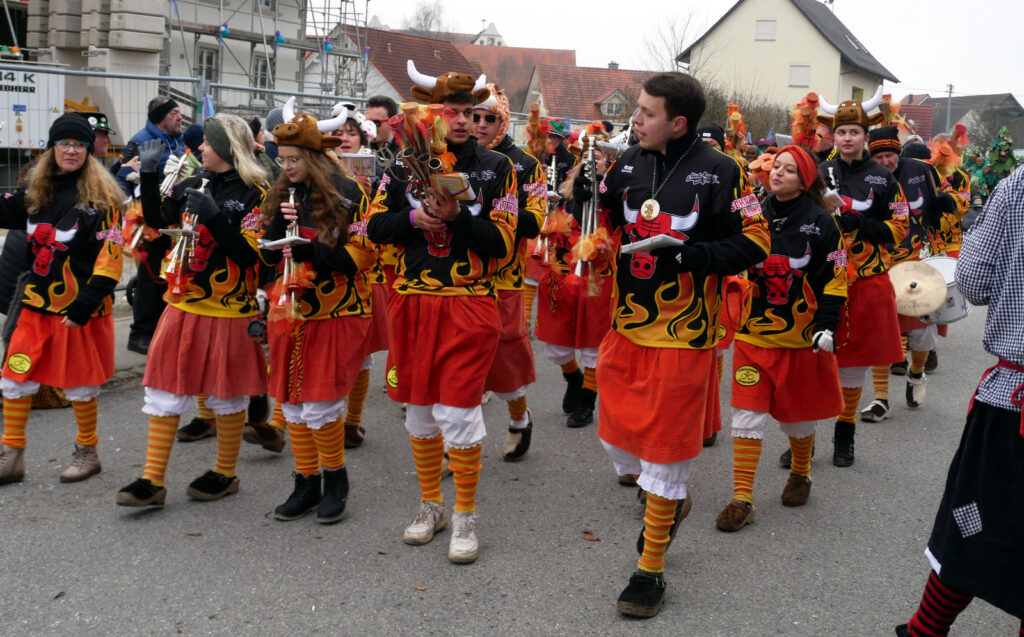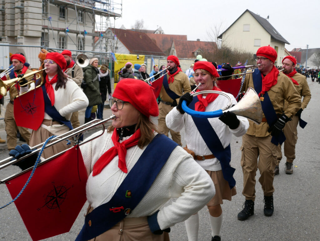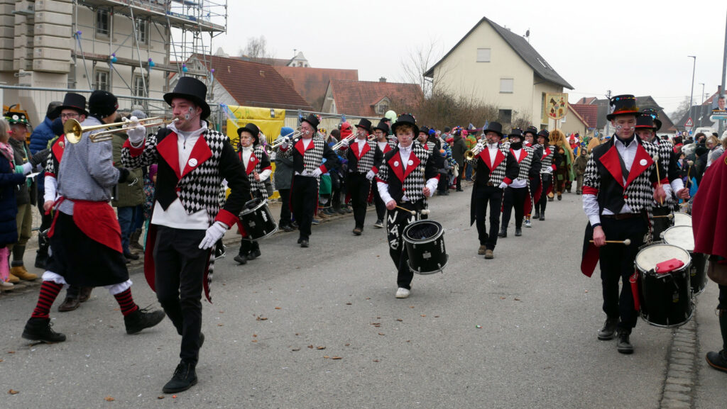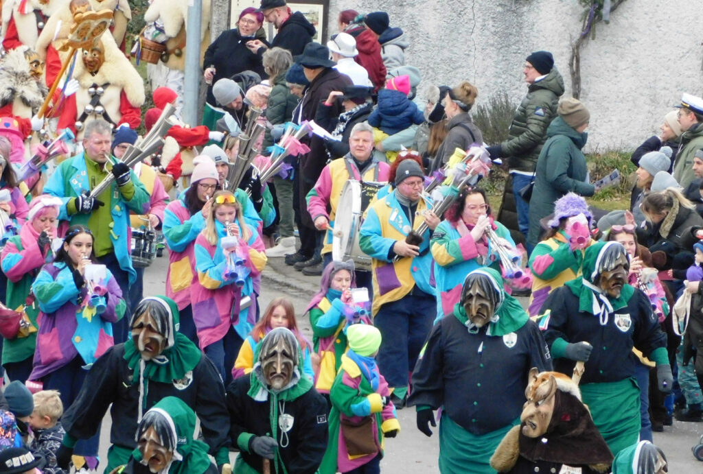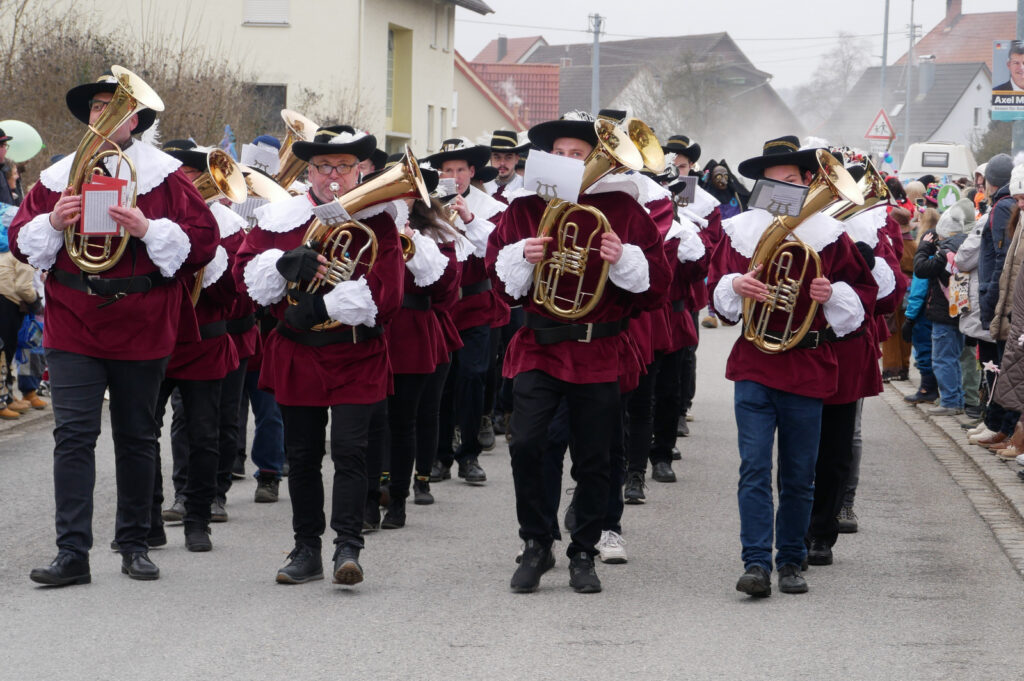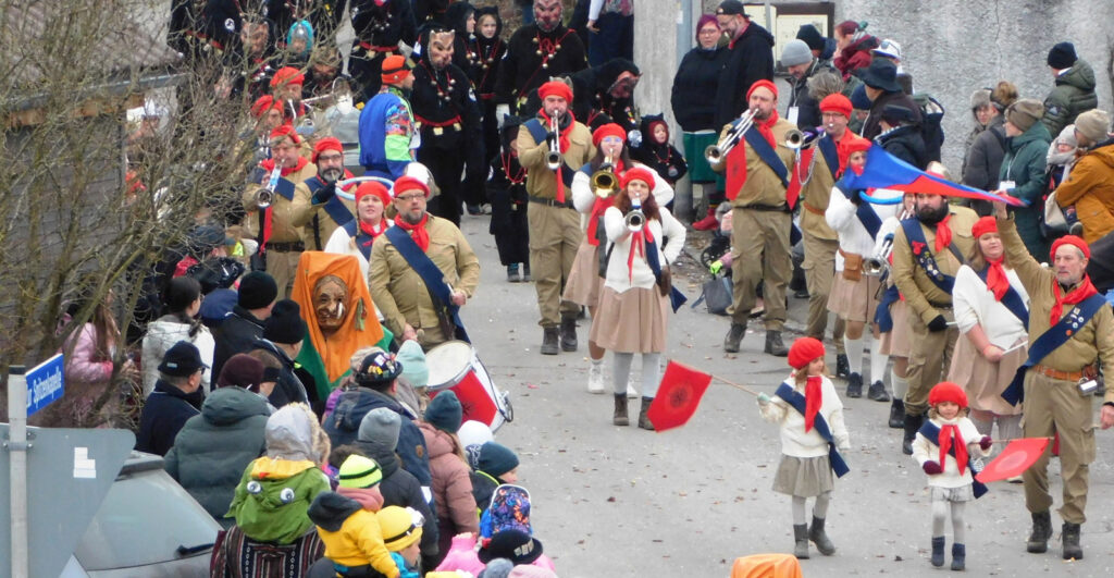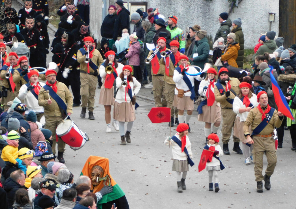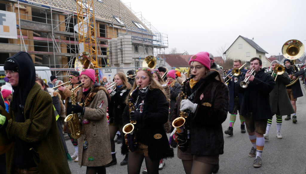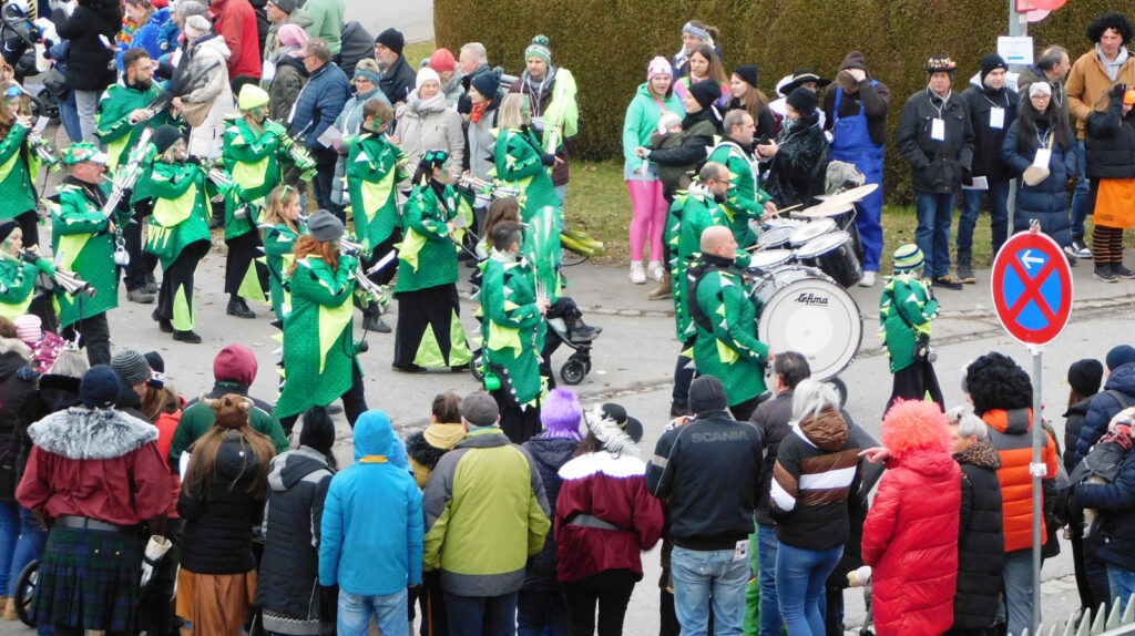 Mit schmissigen, stimmungsvollen Musikbeiträgen animierten zum Mitklatschen der Musikverein Haisterkirch (Bild), die Gugga-Gassa-Fetz-Band aus Bad Waldsee, die Lumpenkapelle Urbachl, D´Hoigamer Schtroßa Hup´r, der Fanfarenzug Reute, die Durlesbach-Schalmeien Reute, die Schalmeien Ellwangen, der Fanfarenzug Berengar Bergatreute, der Fanfarenzug „Graf Humbrecht“ aus Eberhardzell und die Rambassler Unterwaldhausen. Angeführt wurde der Umzug von der Haisterkircher Musikkapelle, den kleinen Narren aus dem Haisterkircher Kindergarten und der Grundschule mit Erzieherinnen, Erziehern und Eltern, alle zusammen bunt närrisch gekleidet, sowie durch Mitspringende der gastgebenden Narrenzunft Waldhex Osterhofen-Hittelkofen, die sich dann zum Umzugsende nochmals eingliederten.