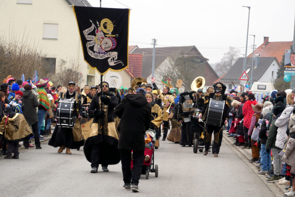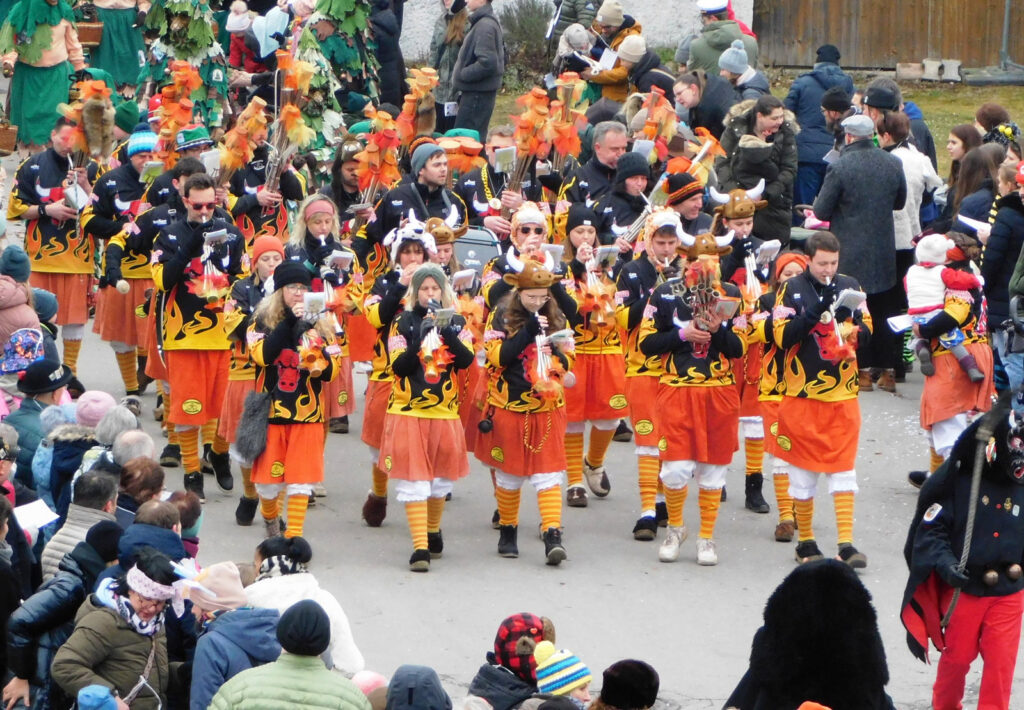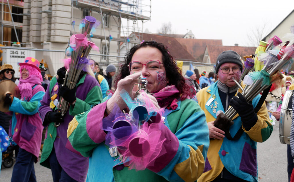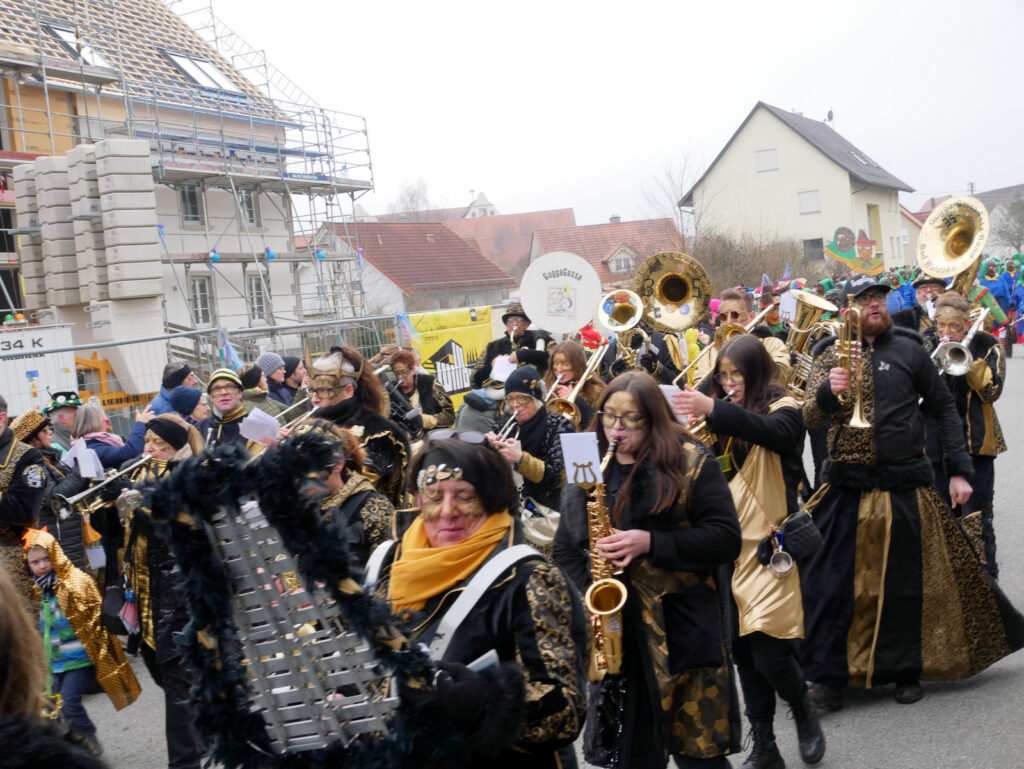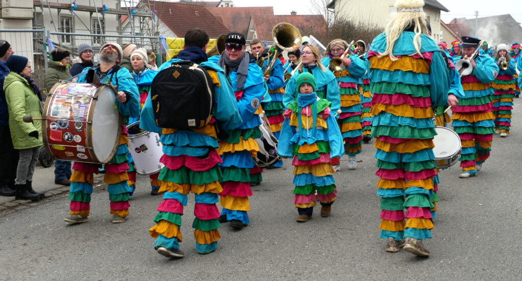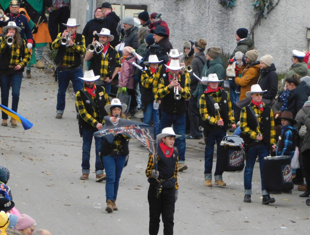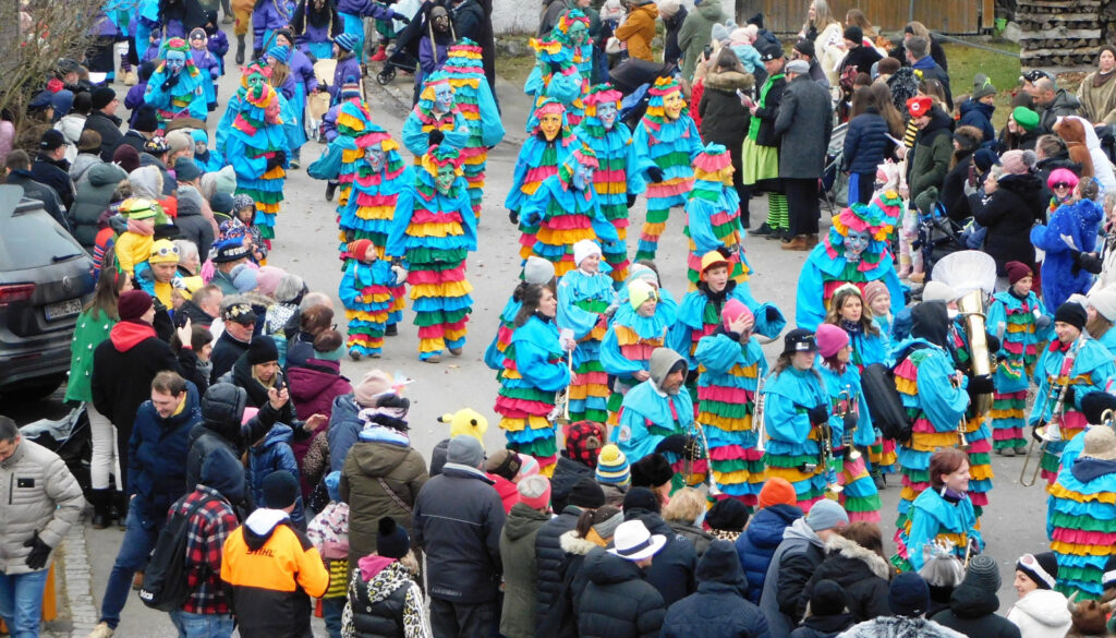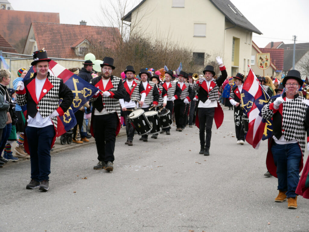 Mit schmissigen, stimmungsvollen Musikbeiträgen animierten zum Mitklatschen der Musikverein Haisterkirch (Bild), die Gugga-Gassa-Fetz-Band aus Bad Waldsee, die Lumpenkapelle Urbachl, D´Hoigamer Schtroßa Hup´r, der Fanfarenzug Reute, die Durlesbach-Schalmeien Reute, die Schalmeien Ellwangen, der Fanfarenzug Berengar Bergatreute, der Fanfarenzug „Graf Humbrecht“ aus Eberhardzell und die Rambassler Unterwaldhausen. Angeführt wurde der Umzug von der Haisterkircher Musikkapelle, den kleinen Narren aus dem Haisterkircher Kindergarten und der Grundschule mit Erzieherinnen, Erziehern und Eltern, alle zusammen bunt närrisch gekleidet, sowie durch Mitspringende der gastgebenden Narrenzunft Waldhex Osterhofen-Hittelkofen, die sich dann zum Umzugsende nochmals eingliederten.