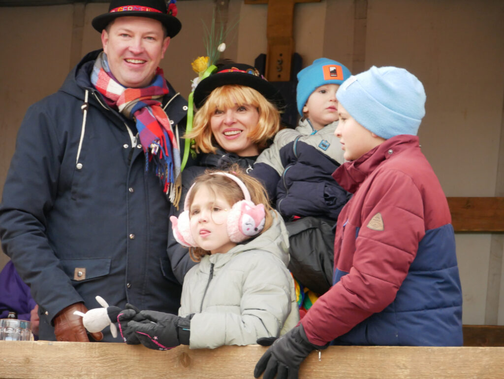 Das gemütliche Beisammensein gefiel auch Oberbürgermeister Matthias Henne mit Familie. Die beiden Pfarrer Stefan Werner und Josef Mattes leiteten mit einem Tischgebet zum gemeinsamen Mittagessen über. Zubereitet hatten das schmackhafte Essen die Landfrauen Haisterkirch-Mittelurbach. Helferinnen und Helfer der Narrenzunft waren auch hier stets im Einsatz.