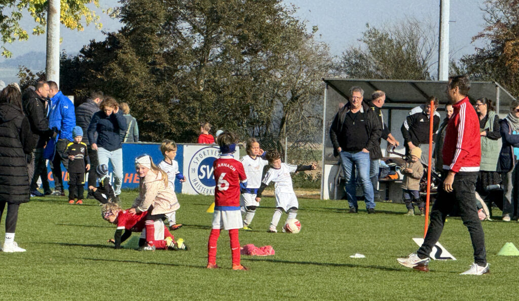 Haisterkirch – Am Samstag (18. Oktober 2025) wurde hier auf dem Sportgelände des SV Haisterkirch („Csardas-Arena“) einer letzten Spieltage für den jüngsten Fußballnachwuchs durchgeführt. Beim Start auf den vier speziell eingerichteten Fußball-Feldern war es noch recht frisch aber schon sonnig. Wie schon beim Frühjahrsturnier konnte erneut ein rekordverdächtiger Besucherzuspruch registrierwerden. Die Parkmöglichkeiten rund um die Gemeindehalle waren schon vor Beginn um 10.00 Uhr voll belegt.
