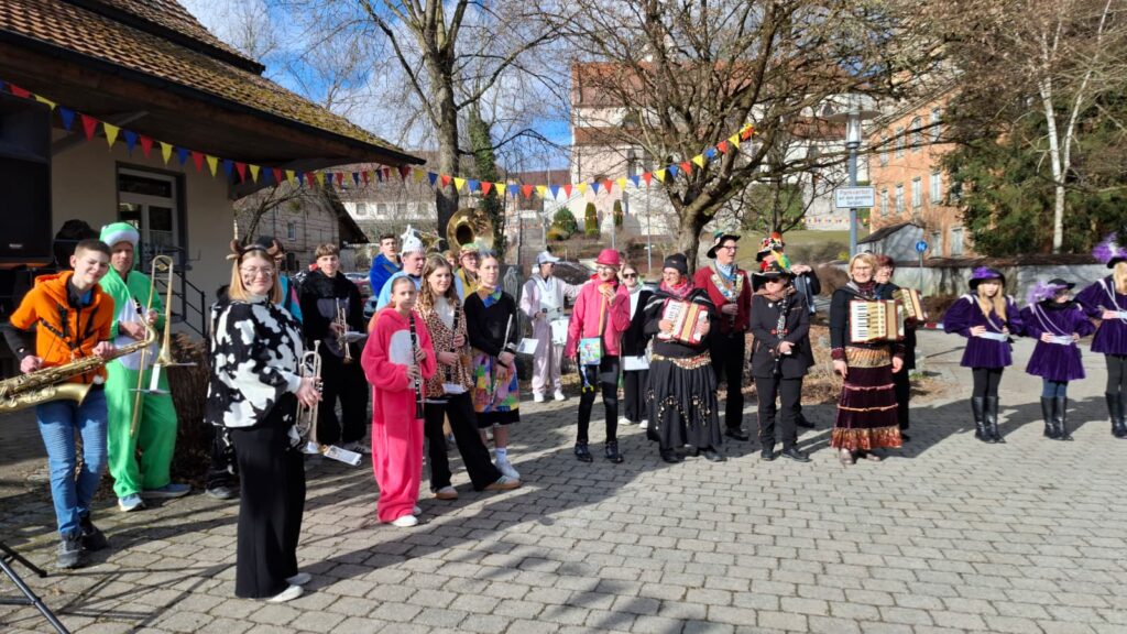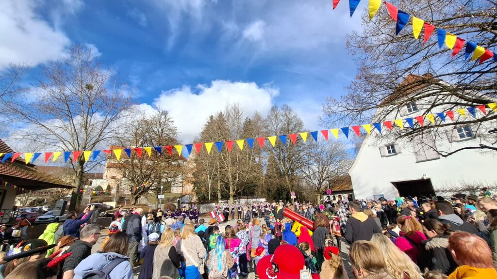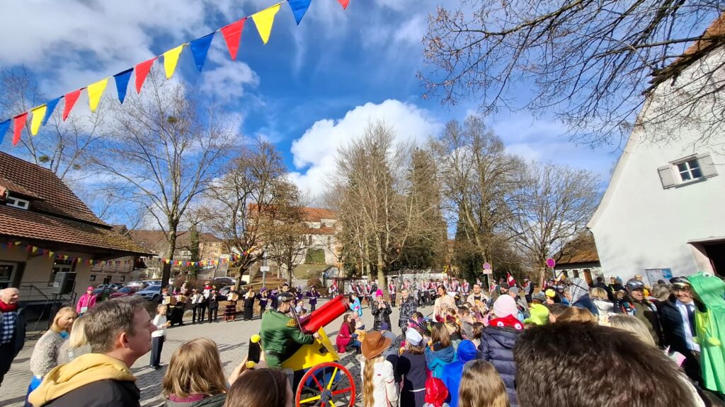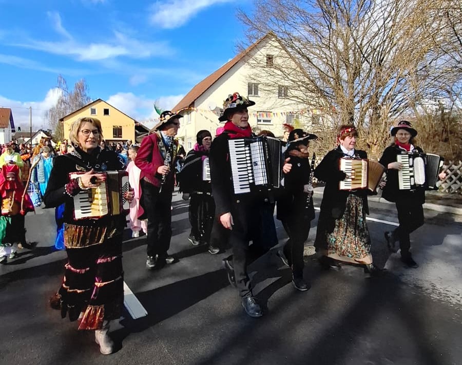 Zahlreiche bunt verkleidete Kinder und Erwachsene schlossen sich dem Zug an, der – wie jedes Jahr – vom Fanfarenzug angeführt wurde. Mit kräftigen Klängen und viel guter Laune bahnte sich die Gruppe ihren Weg durch die Straßen bis zum Dorfplatz. Große Begeisterung lösten die Kanoniere aus, die mit ihrer Narrenrakete wieder reichlich Süßigkeiten und Konfetti in die Menge schossen.