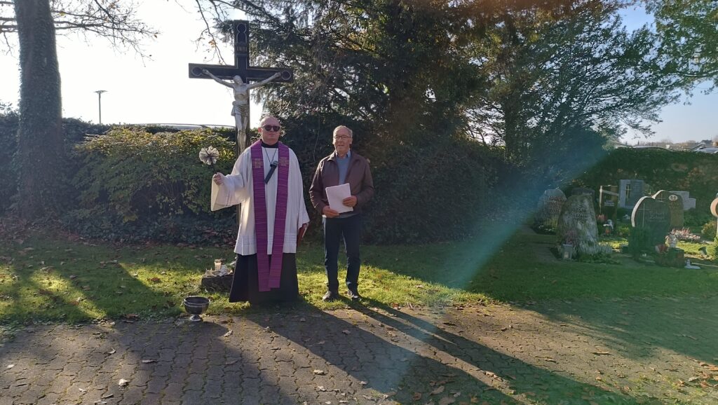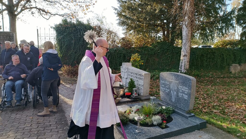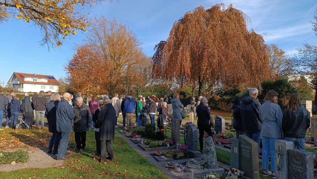 Nachmittags versammelten sich einige hundert Personen auf dem Friedhof in Reute. Bei herrlichem Sonnenschein kamen hier die vielen liebevoll geschmückten Grabstätten zur besonderen Geltung. Pater Hubert Vogel dankte den Angehörigen für ihr Gedenken das ganze Jahr über, insbesondere aber am Festtag Allerheiligen und auch Allerseelen: „Behalten wir unsere Toten in unseren Herzen. An solchen Gedenktage kommen doch ganz viele Familien zusammen, lassen wir hier unsere Verstorbenen wieder unter uns lebendig sein“.