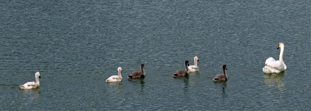 Bad Waldsee (rei) – Als unser Reporter Erwin Linder am 25. Juli um 18.47 Uhr dieses Bild von fünf Schwänen auf dem Bad Waldseer Stadtsee beibrachte, da kam seinem Redaktionsleiter das Friedenslied von Hannes Wader „Zogen einst fünf wilde Schwäne” in den Sinn. Kaum hatte er den Link zu diesem Lied in die Bildschirmzeitung hineingebastelt, da meldete sich „Erre” wieder: Es seien deren acht. Zum Beweis brachte er um 18.58 Uhr nachstehend eingebautes Foto: Dieses zeigt aber „nur” sechs Schwanenkids plus 1 Elternteil. Das andere Elternteil ist unserem Reporter doch glatt aus dem Sucher rausgeschwommen. Aber auch so ist das schon ein bemerkenswerter Schnappschuss. Lob unserem Reporter. Und jetzt empfehlen wir das traurig-schöne Lied von Hannes Wader: