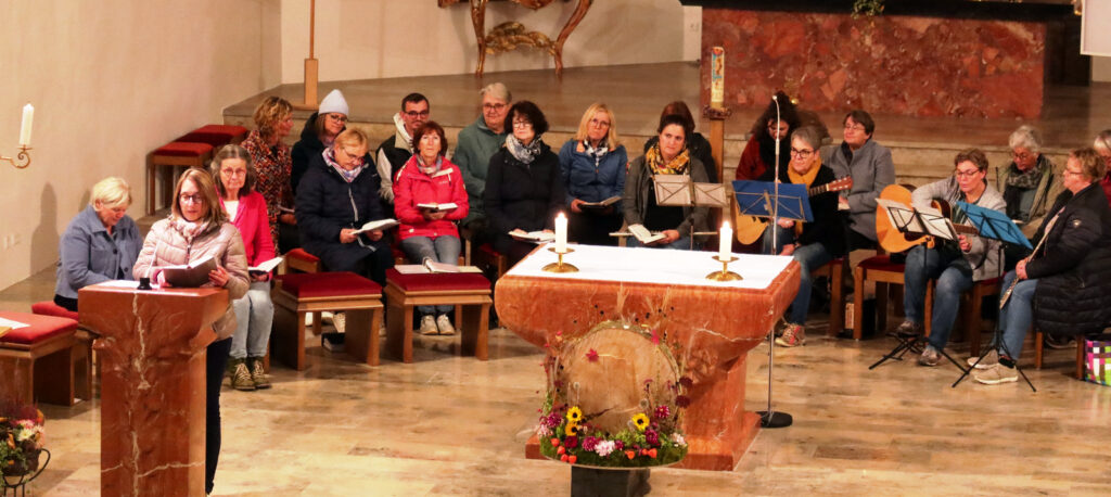 Vertieft mit Beiträgen der Lektorinnen Waltraud Bühler, Heidrun Bayler, Sonja Nell und Ulrike Bertrand wurde die Gebets- und Liederfolge, wozu auch die Rosenkranzbitten „Jesus, der die Schöpfung liebt“ gehörten. „Einfach mal die Welt retten“, wurde allseits betont und dazu dienten auch die nochmals aufgestellten Stelen mit den umrankten, sinnigen Texten.