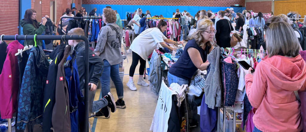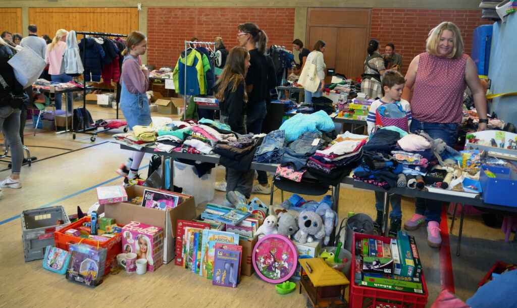 Der Zuspruch war wieder richtig groß an beiden Tagen. Geschätzt sind insgesamt knapp 1000 Personen gekommen. Traditionsgemäß sind wieder je 44 Tische (zu je 10 Euro Miete, bzw. 8 Euro beim Kinderbasar) an den beiden Tagen aufgebaut worden. All dies geschieht mit Frauenpower und mit helfenden Familienmitgliedern beim Auf- und Abbau. Das Shoppingparadies mit Secondhand-Bekleidung war wieder ein Renner. Es hat allen sichtlich Spaß gemacht und fündig geworden sind Käuferinnen und Verkäuferinnen. Diese zweitägige Aktion ist zugleich ein echter, nachhaltiger Beitrag zum Umweltschutz. Das Angebot an Secondhand-Kleidungstücken vom Fuß- bis zum Kopfbereich war wieder umfangreich.. Die Preise waren allgemein familienfreundlich. Der Gesamterlös, auch vom Verkauf von Getränken, Butterbrezeln und gespendeten Kuchen, wird für soziale Zwecke verwendet. Schnäppchenliebhaberinnen durften höchst zufrieden sein. Der Kinderbasar mit Kleidungsstücken samt Spielzeug für Babys und Kinder lockte vor allem wieder viele junge Eltern an. Der Andrang war entsprechend groß.