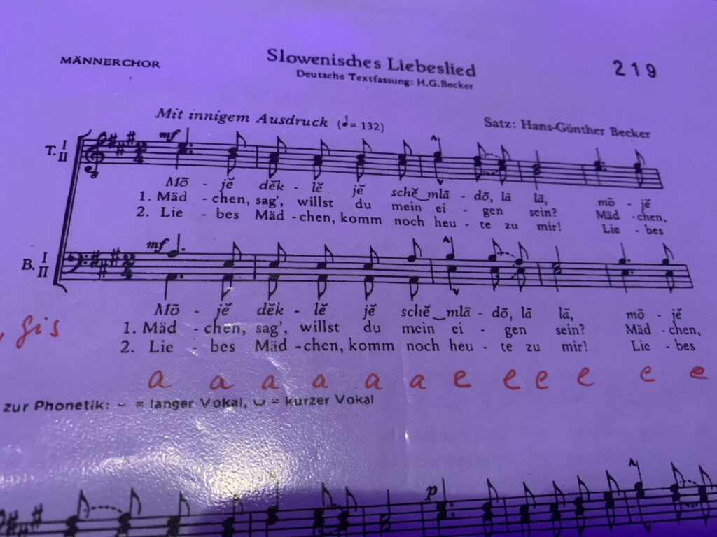 Der militärisch anmutende „Zottelmarsch“ imitiert die oft chaotischen Register in Blaskapellen. Militärisch-zackig grüßt einer der Sänger den Dirigenten Peter Schad, der wiederum mit Zeigefinger seine Stirn tippend den Übereifrigen schnell auf den Boden zurückholte. Und mit dem traditionell-slowenischen Liebeslied „Moje dekle“ fragten die Sänger, wie man das Herz einer Angebeteten erreichen kann, mit gewählten Worten und mit anrührenden Melodien oder mit dem heute üblichen Smartphone? Auch der Titel „Hör mein Lied, Elisabeth“ ging in diese Richtung.