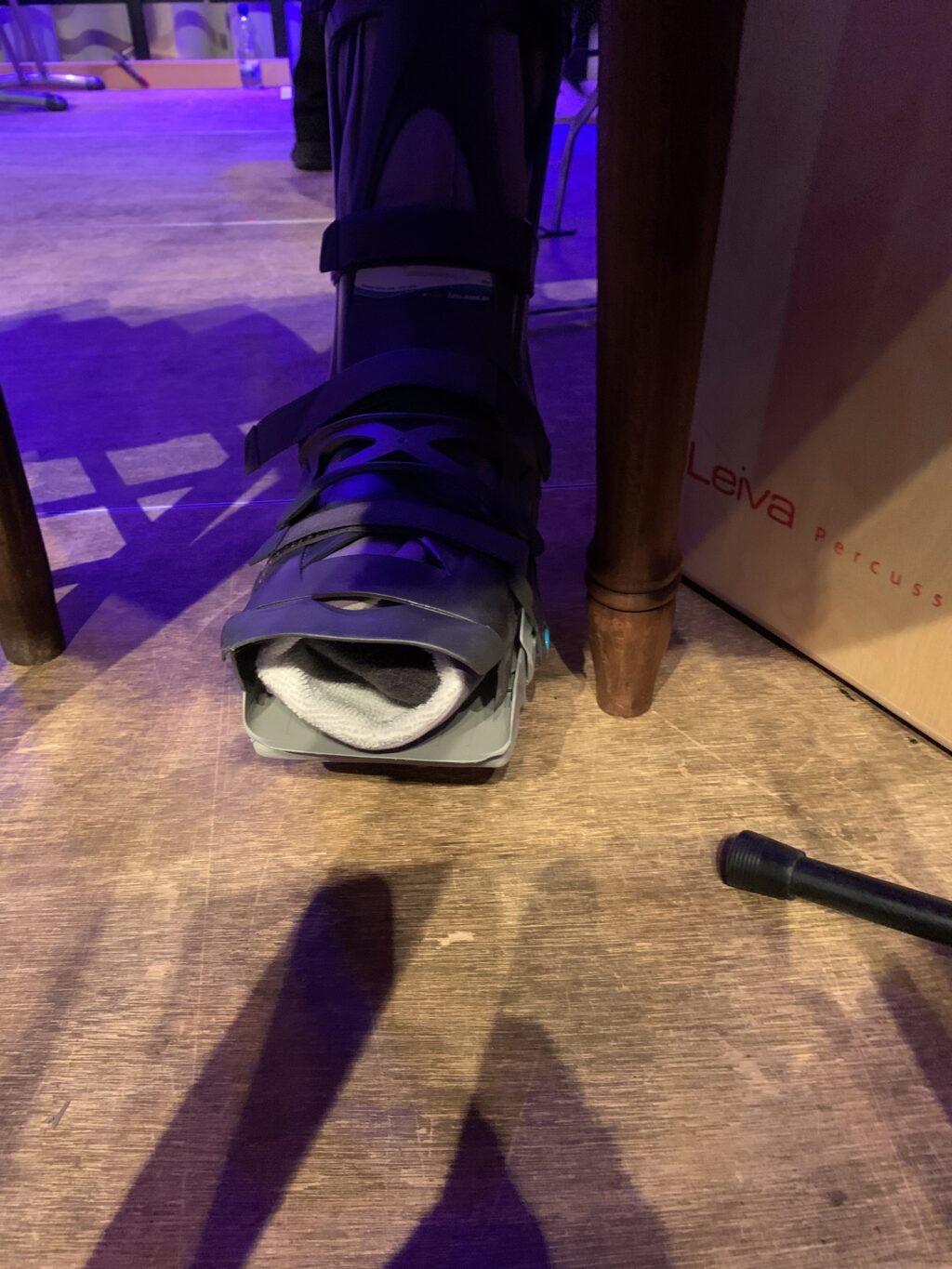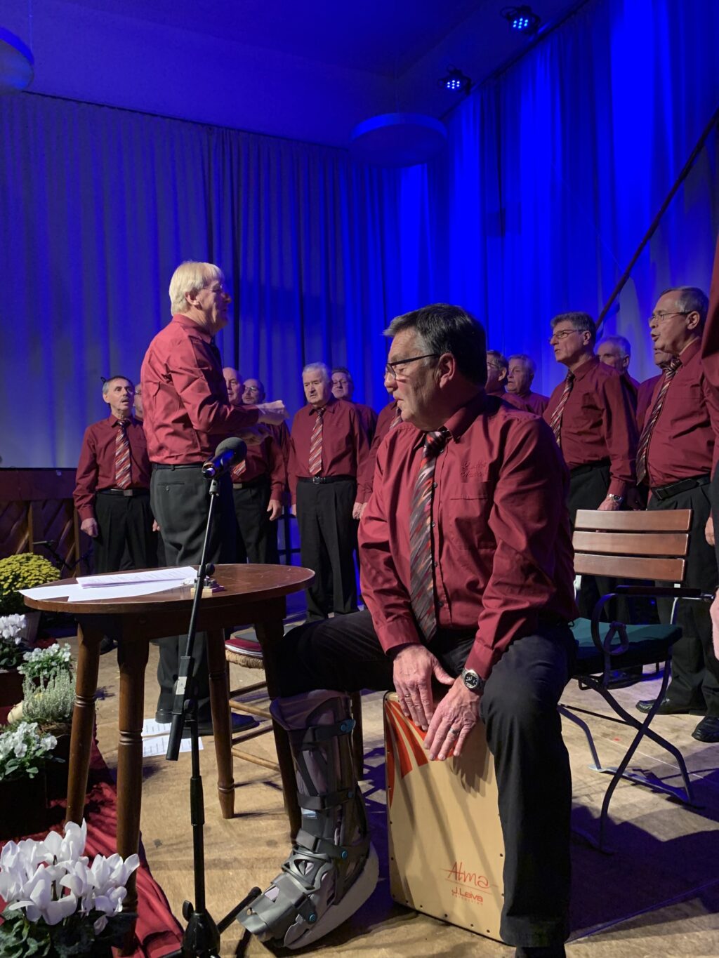 Deger übergab an Nachfolger Josef Matheis, der nicht nur symbolisch, sondern auch real in einen sehr großen Schuh schlüpfte. Auch real deshalb, weil sich der neue “Schwätzer” einen Achillessehnenriss zugezogen hatte und deshalb einen überdimensionalen Spezialschuh tragen musste. Matheis „schwätzte“ daher sitzend, aber souverän durchs Programm, spielte zu etlichen Programmpunkten sein Cajon und meinte, im Gegensatz zu Profis spielen wir auch mit Achillessehnenriss!