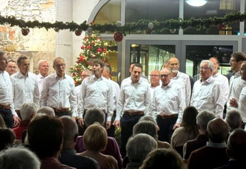 Drei Blöcke, thematisch ausgerichtet auf Winterliches, Adventliches und Weihnachtliches, hatte Katrin Reichle für den 44-köpfigen Männerchor und einem aus der Chorgemeinschaft gebildeten, erweiterten Doppelquartett (Leitung: Stefan Werner) ausgewählt. Ein Dutzend Lieder, viele davon auch mit religiösem Charakter wie „Advent ist ein Leuchten“, „Maria durch den Dornwald ging“, „Zu Bethlehem geboren“, „Hört der Engel helle Lieder“, „Das kleine Jesuskind“, „Frieden sei mit Dir“, „Machet die Tore weit“, oder auch sehr anrührend das Lied „Weit, weit weg“ wurden von den Sängern gesangsstark, melodiös und getragen zu Gehör gebracht.