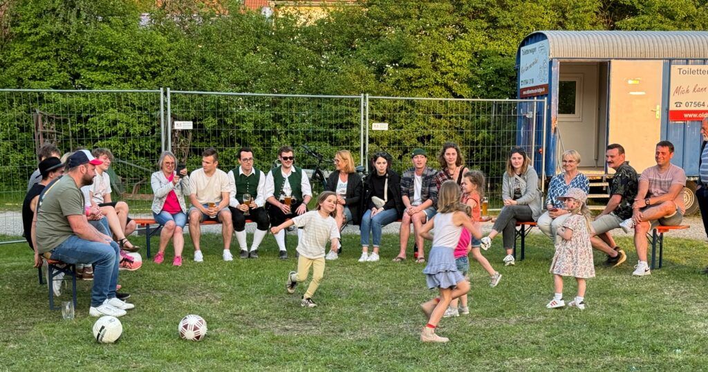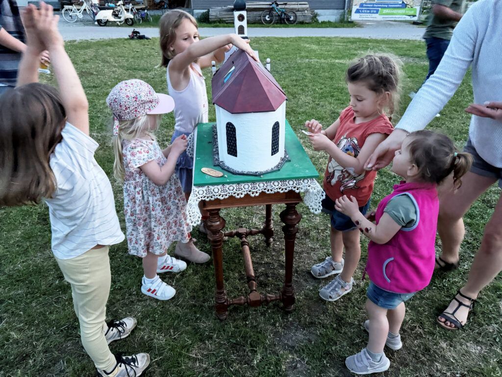 Einige Andachtsbesucher gingen nochmals zurück auf das Festgelände zur „Nachhockete“. Auch einige Kinder, die noch recht bewegungsaktiv waren und ihren Eltern, Großeltern, weiteren Gästen Turnkünste vorführten, durften dafür kleine Geldbeträge einsammeln. Mit dem Sammelerlös wurde dann die „Spendenkapelle“ durch die jüngsten Besucher gefüttert.