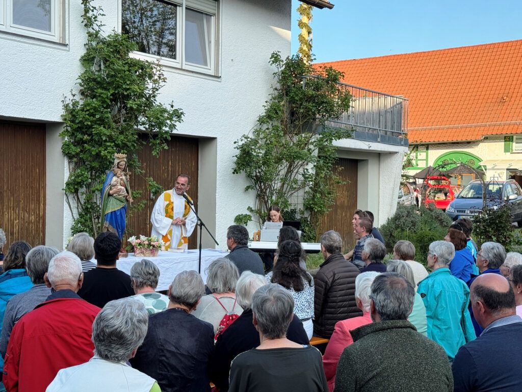Das Ehepaar Josef Ruther und Gertrud Härle-Ruther mit Helfern hatten auf seinem Anwesen Bänke und Stühle bereitgestellt und alles hergerichtet für solch eine Andacht im Freien. Ein ansprechender Maialtar mit einer aus Holz geschnitzten Marienstatue (Mutter Gottes mit Kind) war direkt vor dem Wohnhaus aufgestellt worden. Pfarrer Stefan Werner freute sich darüber, dass die Schar der Maiandachtsbesucher recht groß war und vor allem, dass auch etliche Jugendliche gekommen waren. Über 60 Personen waren gezählt worden. Verena Westhäußer begleitete sehr melodiös und ausdrucksstark an ihrem eigens mitgebrachten Keyboard das passende Liedgut mit bekannten Marienliedern.