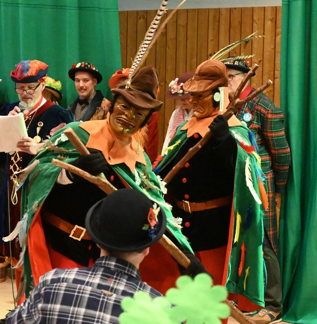 König Berthe erklärt die Herkunft des Heischebrauchs des Waldseer Sammlervölkles zu Gunsten des Waldseer Narrensamens und schickt seine Sammlerinnen und Sammler mit ihren Kässle in den Saal.