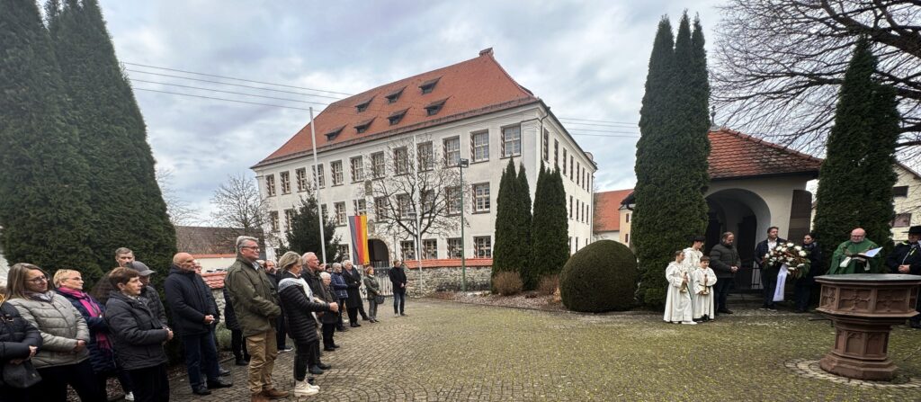 Vor dem Klostergebäude wehte die Flagge in den Bundesfarben auf Halbmast. Direkt bei der Opfer-Gedenkstätte hatte die Musikkapelle Haisterkirch ihren gewohnten Platz eingenommen.