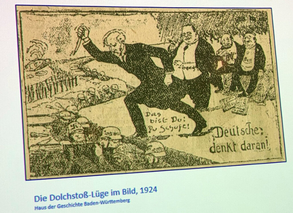 Die Heimat fällt den kämpfenden Soldaten an der Front in den Rücken. Extremistische Darstellung von 1924. Auf zwei Stahlhelmen sind Hakenkreuze erkennbar. Der Messerführende trägt die Züge des sozialdemokratischen Spitzenpolitikers Philipp Scheidemann. Hinter ihm sieht man, die Szene zigarrenrauchend genießend, Matthias Erzberger. Weiter erkennbar: Zerrbilder zweier jüdischer Menschen.