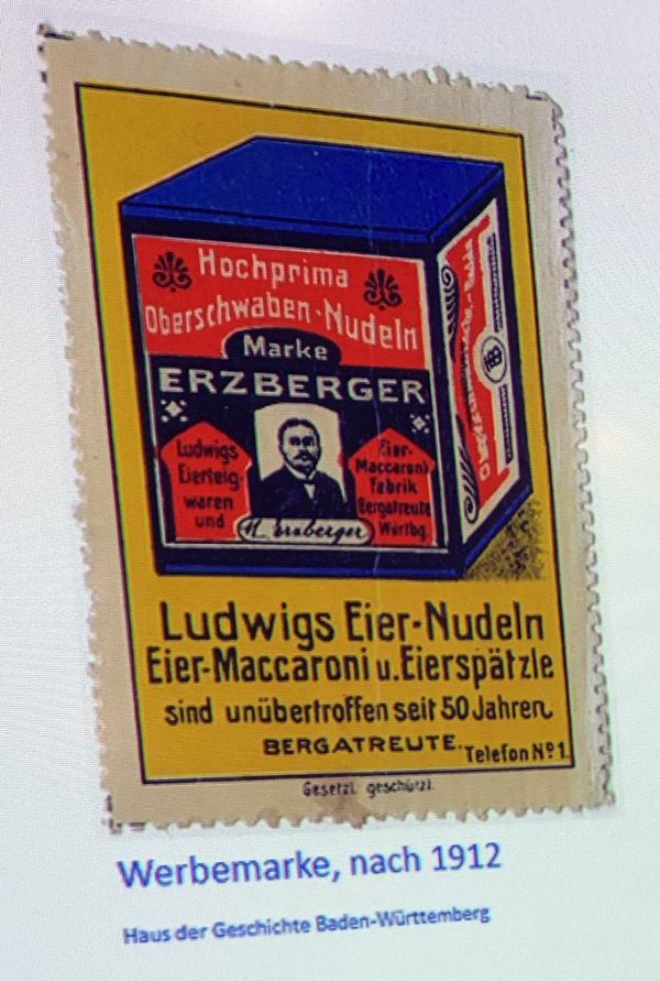 Eier-Nudeln der Marke “Erzberger”. Werbemarke (nach 1912).
