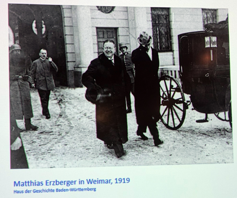 Bereits vor drei Jahren besuchte Dowe das hiesige Archiv, um sich mit lokalen Archivalien über Matthias Erzberger zu beschäftigen. Seit 1903, mit gerade mal 28 Jahren, nämlich vertrat Erzberger als Mitglied des Reichstags den Wahlkreis Biberach, Leutkirch, Wangen, Waldsee als katholischer Zentrumsabgeordneter. Im August 1921 verbrachte Erzberger mit seiner Familie einen kurzen Erholungsurlaub im Bad Griesbacher Müttergenesungsheim und wollte anschließend zum Katholikentag nach Frankfurt. Am 26. August, ein trüber Sommertag, traf er sich mit dem befreundeten badischen Zentrumsabgeordneten Carl Diez. Am Vormittag unternahmen sie einen gemeinsamen Spaziergang und wollten zum Mittagessen zurück sein. Unterwegs wurden sie von zwei jungen Männern überholt, die ihnen dann wieder begegneten und Pistolen auf die beiden Politiker richteten. Erzberger wurde durch gezielte Kopfschüsse sofort tödlich verletzt und rollte bis zum Stamm einer Tanne. Diez ging mit seinem Schirm auf die beiden los, wurde aber ebenfalls von den Mördern angeschossen, schwer verwundet überlebte er aber den Anschlag. Die Todesnachricht musste der örtliche katholische Pfarrer der Familie überbringen. Dies war der erste Mord an einem amtierenden Politiker in der von Hass und Hetze gespaltenen jungen Weimarer Republik.