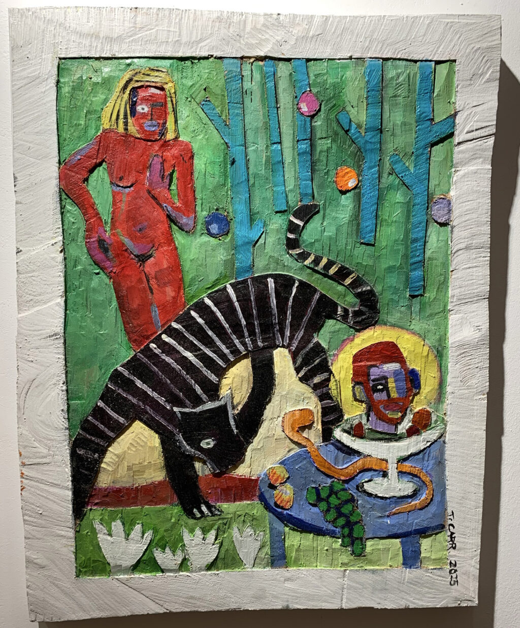 Dieses Anliegen verfolge der Künstler auch in seinen neueren Holzreliefs in lebendiger und kraftvoller Farbigkeit. Christliche Werte werden hier auf den Kopf gestellt, Figuren erscheinen entblößt bzw. entheiligt. Natalie Carr sieht darin zeitgenössische Gegenaltäre einer Gesellschaft, die ihre christlichen Werte noch nicht (?) verloren hat, sondern sie bewusst umkehrt. Ob mit diesen Darstellungen eine Erneuerung der Werte gefunden wird, überlässt Terence Carr wohl dem jeweiligen Betrachter.