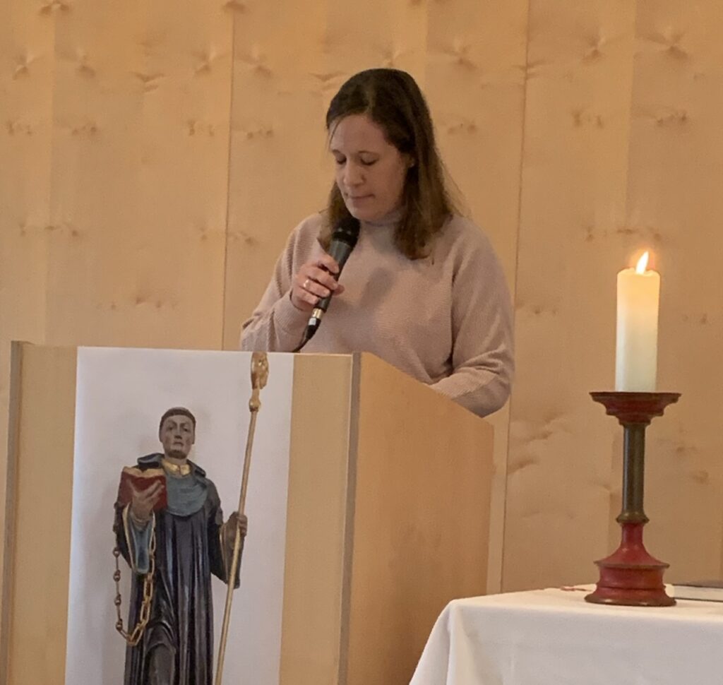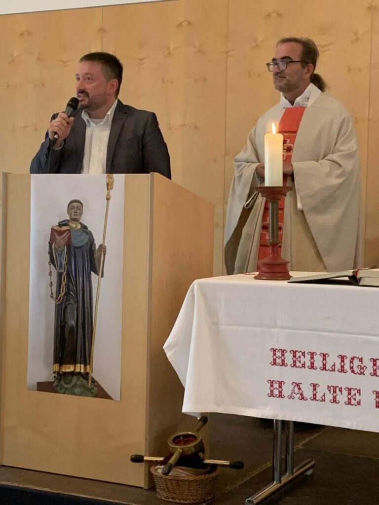 Ortsvorsteher Achim Strobel dankte allen, die gekommen waren: den Gottesdienstbesuchern, den Reitern, allen, die Gaisbeurens großen Tag, den Leonhardstag, hochhalten. Am Ambo ein Bild des Ketten lösenden Heiligen.