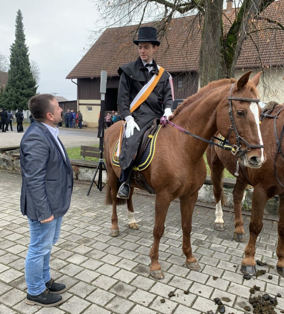 Am Dorfgemeinschaftshaus gab es Verpflegung und Getränke für die zurückgekehrten Reiterinnen und Reiter, auch ein Schnäpsle zum Aufwärmen! Ortsvorsteher Strobel dankte nochmal allen, die gekommen waren, insbesondere Pfarrer Werner, und freute sich, dass der Ritt ganz ohne Regen und Unfall verlief. Genau zu diesem Zeitpunkt fing es tatsächlich an zu regnen.