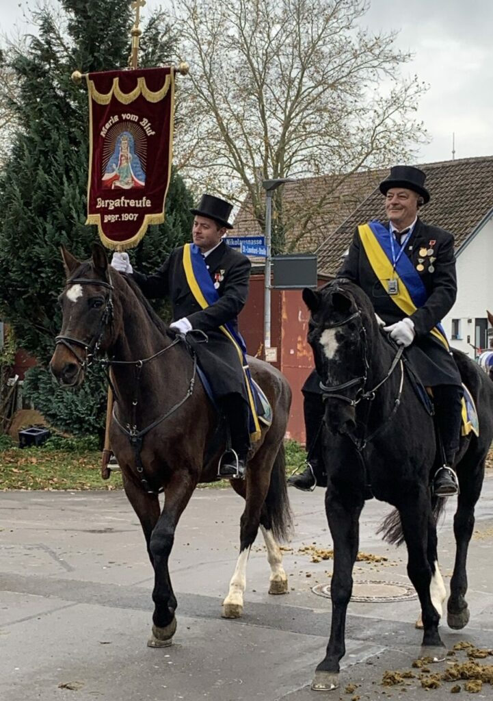 Von Leonhards Lebensweg vor fast 1500 Jahren können wir Heutigen immer noch viel lernen. Statt Karriere in Adelskreisen oder kirchlichem Bischofsamt zu machen, widmete er sich lieber den Hilfsbedürftigen, den Kranken oder Menschen in Kerkern, aber auch Tieren! Sein Beten führte Viele zurück in die Freiheit, insbesondere, wenn auch sie selbst sich für ihre Nächsten einsetzen wollten. Weil er Ketten zum Bersten brachte, gilt er als Kettenheiliger und als Schutzpatron für Vieh und insbesondere für Pferde. Vier aktuelle Gesichtspunkte sprach Pfarrer Werner in der Feier an: die Gleichheit aller bei Vielfalt und Respekt, die Gemeinschaft in Bus, Bahn, Schule, Arbeitsplatz, Verein und Kirche, die geschenkte Freiheit weg von den Sorgen, dem Leistungsdruck, hin zu „ich kann Gutes tun“, beispielsweise jemand in den Arm nehmen und mit Gott leben, was Kraft aus Glauben schenkt, sehen, was Gott geleistet hat, Fehler und Möglichkeiten sehen oder Gesellschaft heller und menschlicher gestalten. Diese Vorstellungen sind auch im Matthäusevangelium zu finden, in dem der höhere Wert des Himmelreichs gegenüber gefundenen Schätzen und Perlen beschrieben wird (Matthäus 13, Vers 44-46). Die Feier wurde würdig von Volker Schuhmachers Familiengottesdienstband umrahmt. Die Fürbitten wurden von zwei Ministrantinnen vorgetragen. Ortsvorsteher Achim Strobel entschuldigte Oberbürgermeister Matthias Henne – er feierte seinen Geburtstag – und Bürgermeisterin Monika Ludy wegen Terminüberschneidungen, dankte anschließend allen, die zum Gelingen des Fests beigetragen haben und forderte nochmal zum Menschsein oder zum Sicheinbringen auf. Er wünschte dem sich anschließenden Ritt trockenes Wetter und gesunde Rückkehr.