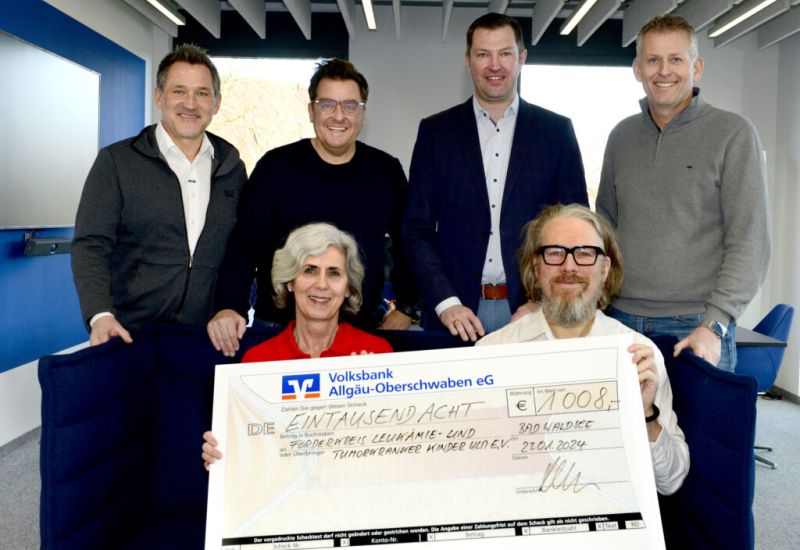 Thorsten Manz, Stefan Scheiter (von links) sowie Daniel Eberle und Jan Emele (von  rechts) überreichten Beatrix Pleli einen Scheck in Höhe von 1008 Euro für den Förderkreis für tumor- und leukämiekranke Kinder Ulm. Vermittelt hatte die Aktion Oberbürgermeister Matthias Henne.