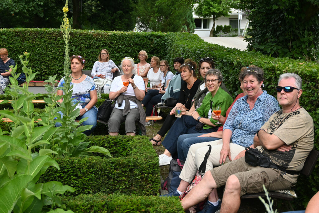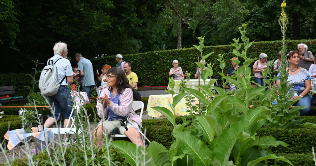 Der Kräutergarten, in dem das Fest stattfand, war in voller Blüte. Die liebevoll angelegten Beete waren ein wahres Paradies für Augen und Sinne. Doch leider wird dieser idyllische Ort bald den geplanten Bauarbeiten im Kurgebiet weichen müssen. Es war ein wahrer Genuss, sich an diesem Sommerabend inmitten der Kräuterpracht aufzuhalten und bei frischen Getränken – ob mit oder ohne Alkohol – mit vielen Bekannten zu plaudern. Auf den zahlreichen Sitzgelegenheiten rund um die Kräuterbeete wurde der Austausch gepflegt, und die entspannte Atmosphäre lud zum Verweilen ein.