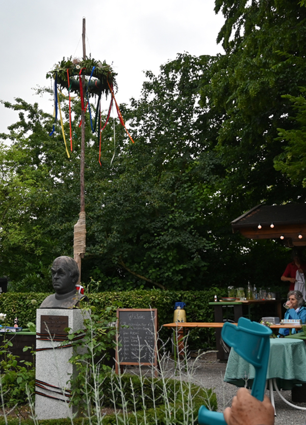 Pfarrer Kneipp gab der Midsommarstang im Kneippgarten einen festen Stand; sie war am Sockel der Büste angebunden.