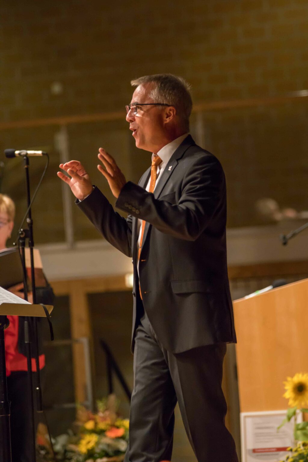 Damit die ca. 450 Besucherinnen und Besucher alle einen Sitzplatz in der wunderschön herbstlich dekorierten Durlesbachhalle fanden, musste noch nachgestuhlt werden. Es war mehr als nur eine „Nette Begegnung“, die vom Chor zur Begrüßung besungen wurde. Die Vorsitzende Juliane Dobner freute sich, zahlreiche Ehrengäste begrüßen zu dürfen. Erich Arzenbacher für die Ortschaft Reute-Gaisbeuren, Sr. Maria Hanna Löhlein vom Kloster Reute, Bürgermeister a. D. Prof. Rudolf Forcher mit Frau und René Auer mit Frau gehörten ebenso dazu wie auch MdB Axel Müller und MdL Raimund Haser.