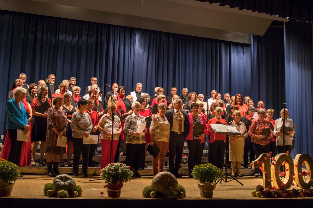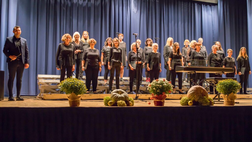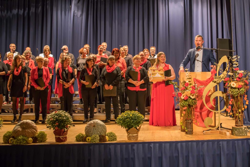 Für das letzte Stück lud der Chor ehemalige Sängerinnen und Sänger zum Mitsingen auf der Bühne ein. Stimmgewaltig erklang „Als Freunde kamen wir“ und das Publikum dankte mit Standing Ovations für einen gelungenen Konzertabend, der mit der Zugabe von „Mambo“ endete.