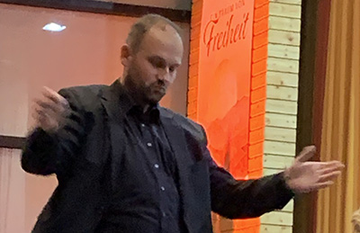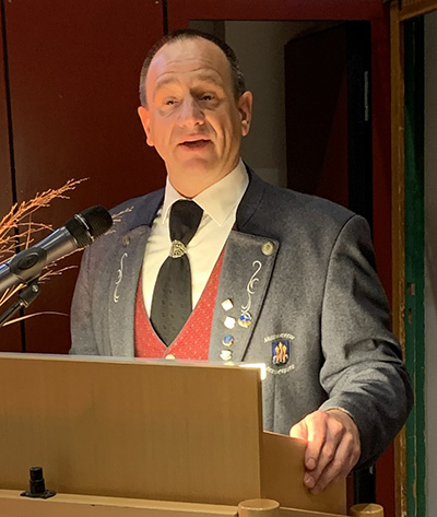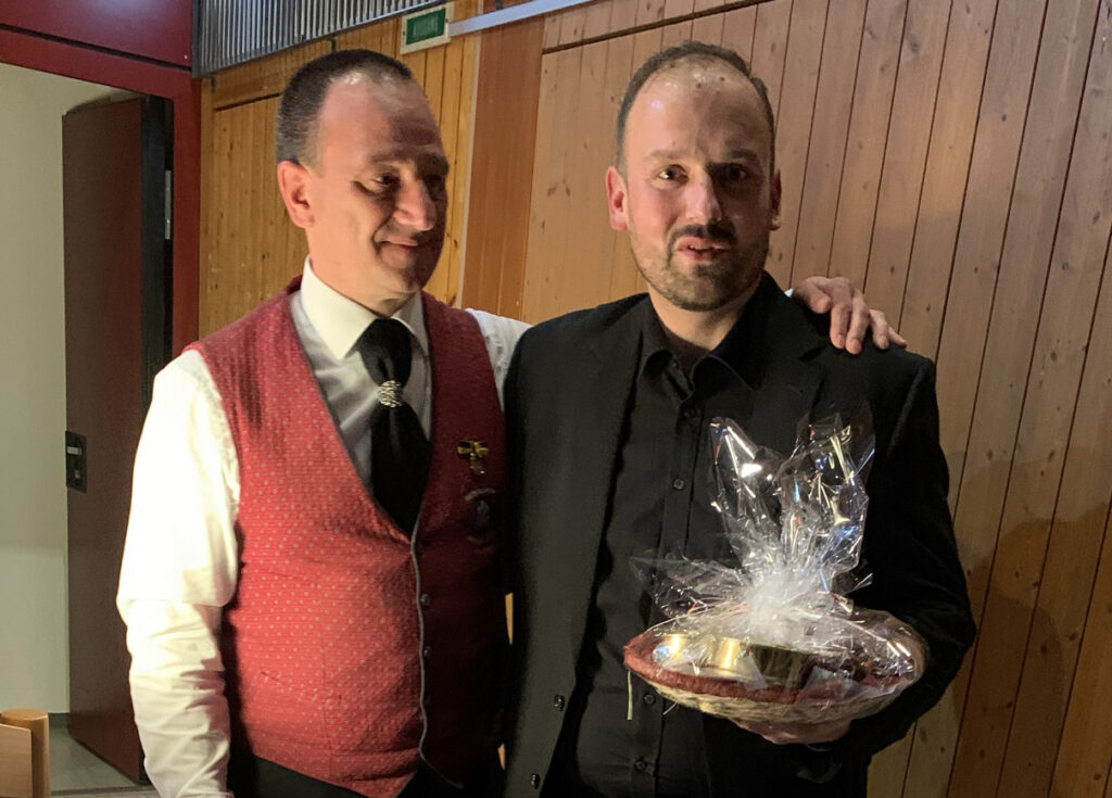 Vorstand Marc Kovatschevitsch (Bild) dankte schließlich allen sehr herzlich, die diesen Abend möglich gemacht haben, und hob die Notensponsoren und die Moderatorin hervor. Der Dirigentin überreichte er ein Blumengebinde, dem Dirigenten ein Geschenk, für den Musikverantwortlichen Johannes Sonntag gab es ein Partyfass. Und weil der Musikverein Bergatreute auf Dirigentensuche ist, bezeichnete der Vorstand das Herbstkonzert quasi als „Vorstellungsgespräch“ mit bester Wirkung. Bei der Begrüßung zu Beginn hatte erv erwähnt, dass der verhinderte Bürgermeister Helmfried Schäfer und der gleichfalls verhinderte Ortspfarrer Klaus Stegmaier sich entschuldigt hatten.