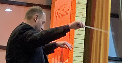 Mit der Polka „Ein Egerländer Traum“ übernahm Roland Schmid (Bild) wieder den Taktstock. Damit gelangte das Publikum in die heiteren Sphären der Freiheitsträume. Flott gespielt empfand man sich rasch freier und der obligatorische Paukenschlag am Schluss tat sein Übriges!