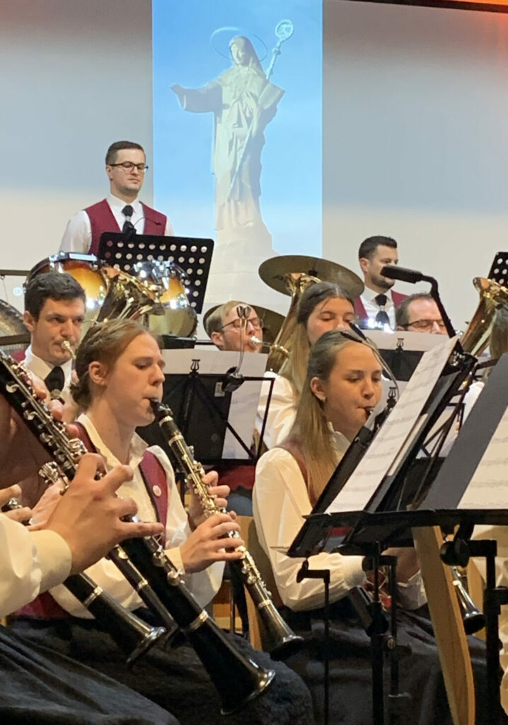 Verena Baumann führte nun sehr fundiert in die Pop-Overture „Odilia“ ein. Dieses Stück behandelt das Leben der Heiligen Ottilie, Schutzpatronin des Elsaß sowie der Augen. Von Geburt an erblindet,  kommt sie im Alter von zwölf Jahren ins Kloster und wird dort durch ein Wunder sehend. Ottilie empfindet zunächst Freiheit nur von innen. Mit ihrem Glauben und ihrer Zuversicht nimmt sie nun  ihre Freiheit mit eigenen Augen wahr. Das Bild des Ottilienklosters auf bizarrer Höhe im Hintergrund vor Augen, interpretierten die Musiker äußerst sensibel, eingehend auf den Wallfahrtsort, wo auch die Reliquien der Heiligen aufbewahrt sind. Der Vortrag vermittelte zudem eine ansteigende Aufbruchstimmung.