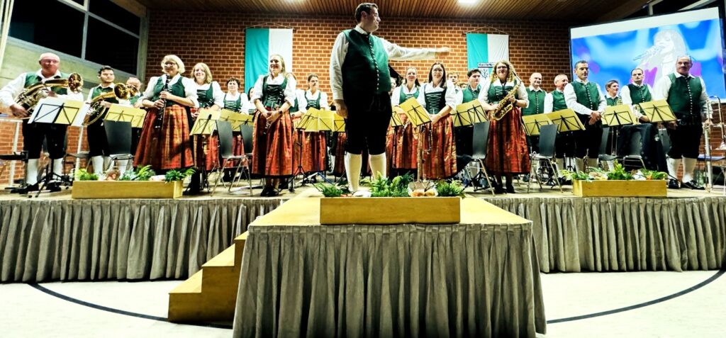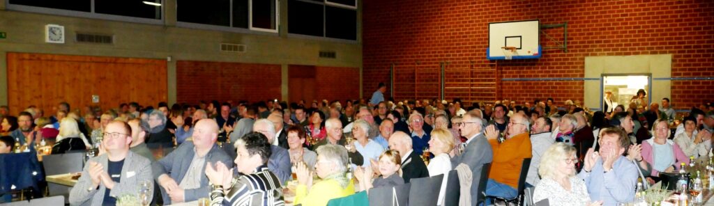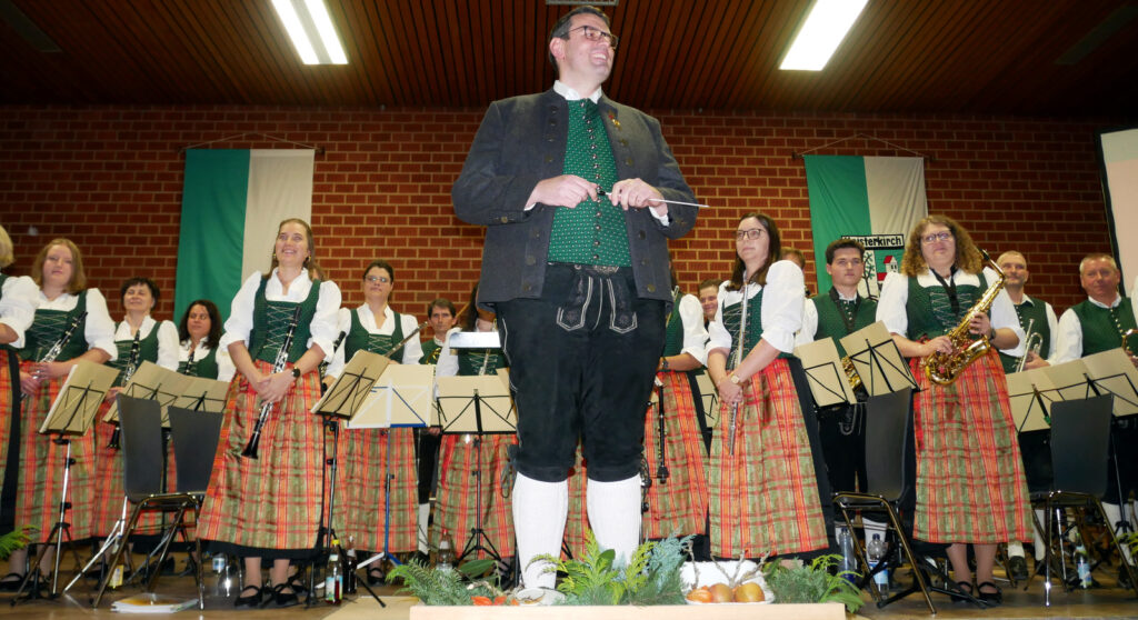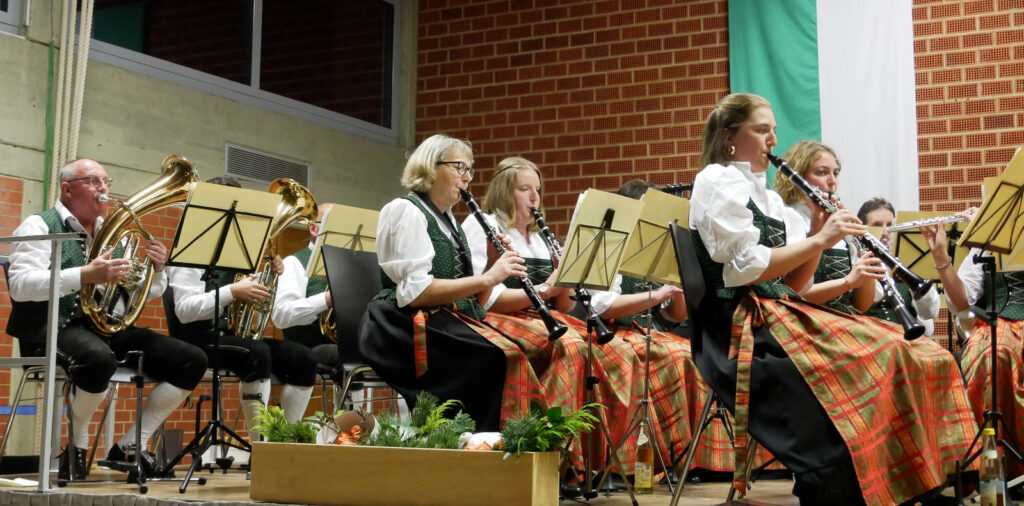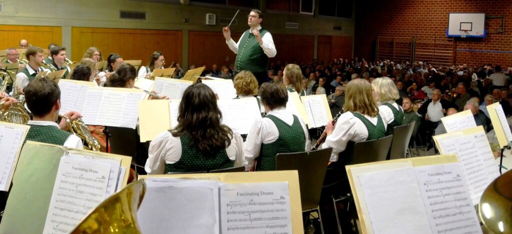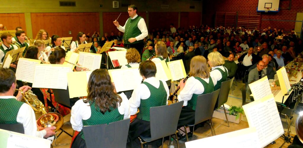 Hans-Peter und Claudia Waibel hatten die Halle herbstlich festlich geschmückt. Dazu gehörten auf den Tischen nette Gestecke, die auf das musikalische „8-Gänge Menü“ hinwiesen. Dirigent Klaus Wachter, weithin bekannt in der Blasmusikszene, hatte für das 2. Jahreskonzert unter seinem Dirigat ein musikalisches Menü ausgewählt, das größten Anklang finden sollte. Die Programmfolge war von ihm so geschickt zusammengestellt worden, dass das verheißene „musikalische 8-Gänge Menü“ genussvoll von allen Gekommenen aufgenommen werden konnte. Erkennbar war dies deutlich am stets prasselnden Beifall. Er hatte gefällige Werke ausgewählt und mit der 52-köpfigen Musikerschar fleißig eingeübt.