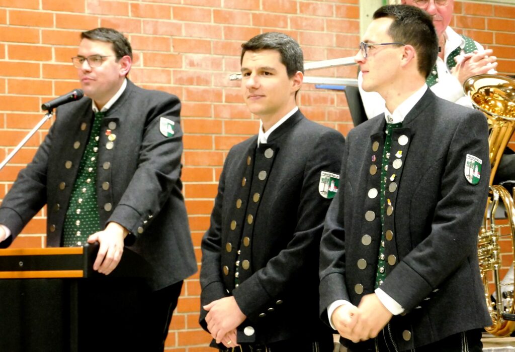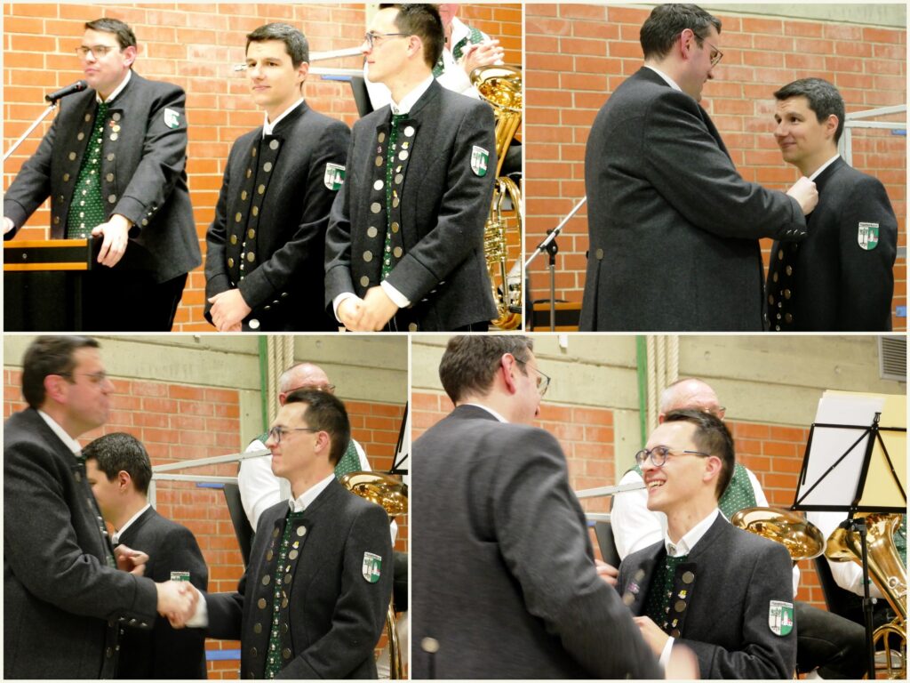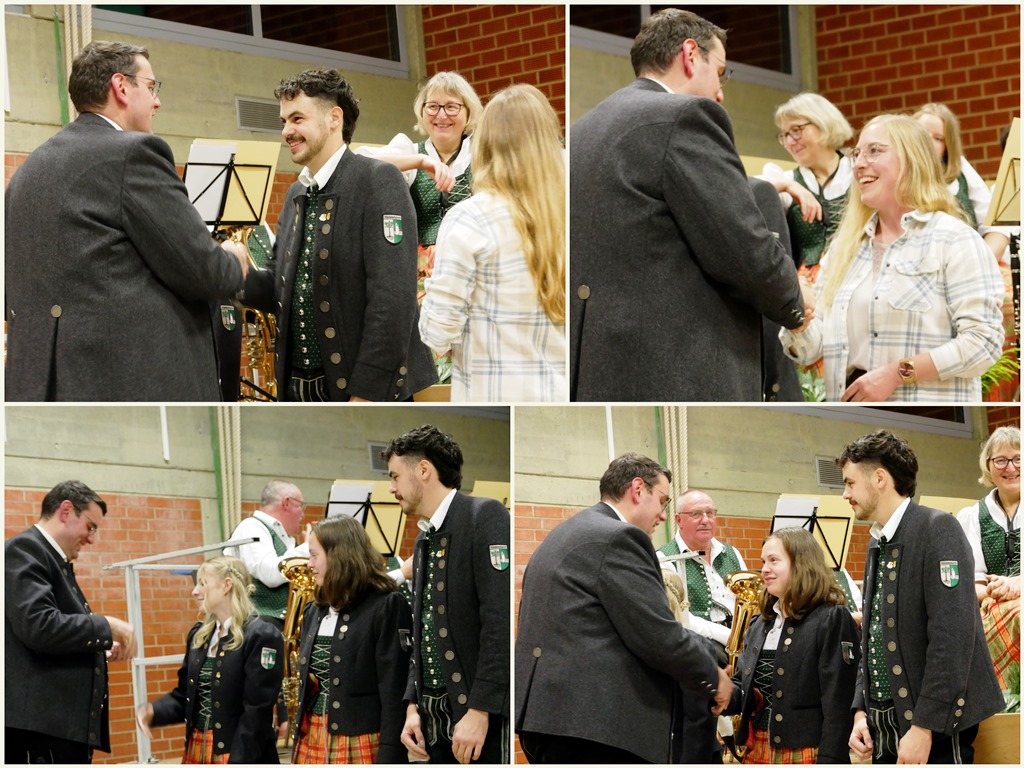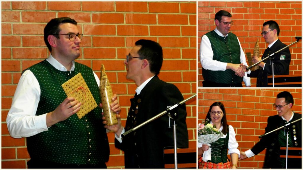 Mit Dankesworten, gerichtet ans Service-Team in der Halle und in der Küche, an die fleißigen Musikerinnen und Musiker und an das so viel Applaus spendende Publikum, leitete der Vorstandsvorsitzende Daniel Maucher über zum inoffiziellen Teil des Abends. Bei der Übergabe von Dankespräsenten an Klaus Wachter und an Verena Maucher schwoll der Applaus nochmals an, übrigens auch beim besonderen Dankeschön für den Gastmusiker Fabian Kiekopf (E-Bass) und für Schriftführerin Leonie Waibel.