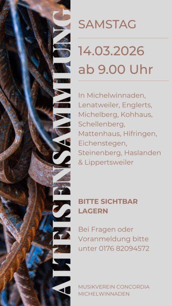 Michelwinnaden – Am Samstag, 14. März, führt der Musikverein Michelwinnaden eine Alteisensammlung in und um Michelwinnaden durch. Außerhalb von Michelwinnaden wird in den Ortschaften Michelberg, Lenatweiler, Englerts, Schellenberg, Mattenhaus, Kohhaus, Hifringen, Steinenberg, Eichstegen, Haslanden und Lippertsweiler gesammelt.