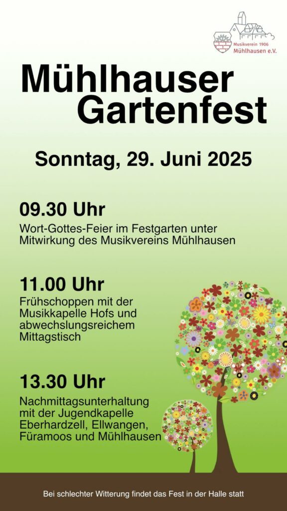 Mühlhausen – Am Sonntag, 29. Juni, findet anlässlich des Herz-Jesu-Festes das traditionelle Gartenfest des Musikvereins statt. Der Tag beginnt um 9.30 Uhr mit einer Wort-Gottes-Feier unter Mitwirkung des Musikvereins Mühlhausen. Anschließend laden wir Sie recht herzlich zum Frühschoppen mit der Musikkapelle Hofs in den Festgarten der Turnhalle ein. Für Ihr leibliches Wohl ist mit einem abwechslungsreichen Mittagstisch, Wurstwagen und Kuchentheke bestens gesorgt. Zur Nachmittagsunterhaltung übernimmt die gemeinsame Jugendkapelle Eberhardzell-Ellwangen-Füramoos-Mühlhausen.