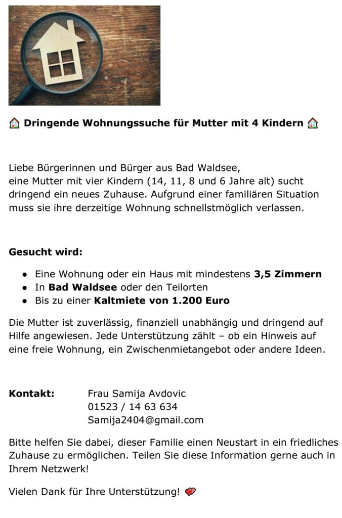 Bad Waldsee – Eine dringende Bitte: Eine Mutter mit vier Kindern sucht schnellstmöglich eine Wohnung. Wer kann helfen? Nachstehend die Bitte:
